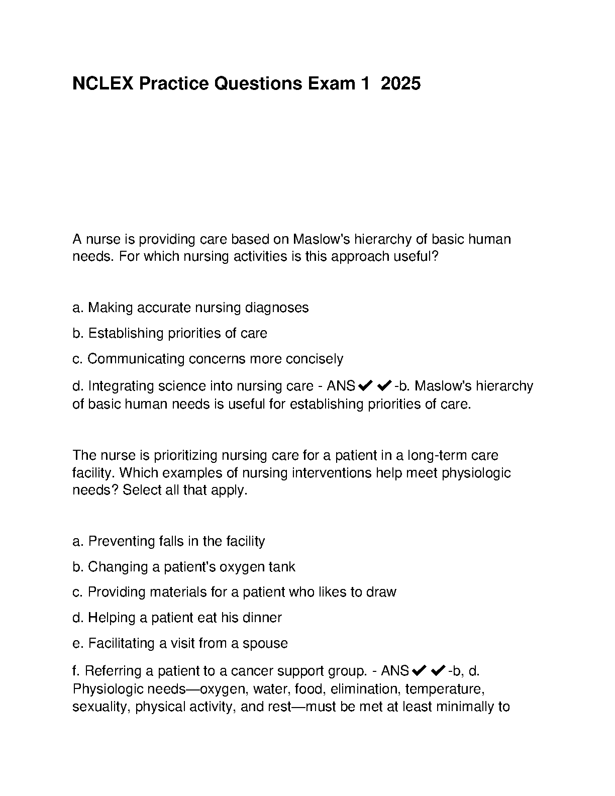 Unlock your nursing career potential with our comprehensive NCLEX Exam 1 study guide for the 2025/2026 academic year. This resource is packed with the latest practice questions, complete with verified answers and detailed rationales, designed to mirror the actual exam format. Master key concepts like care prioritization and nursing fundamentals. This essential tool is expertly crafted to boost your confidence, eliminate exam anxiety, and help you pass the NCLEX on your very first attempt. Stop worrying about resits and start preparing for success today!