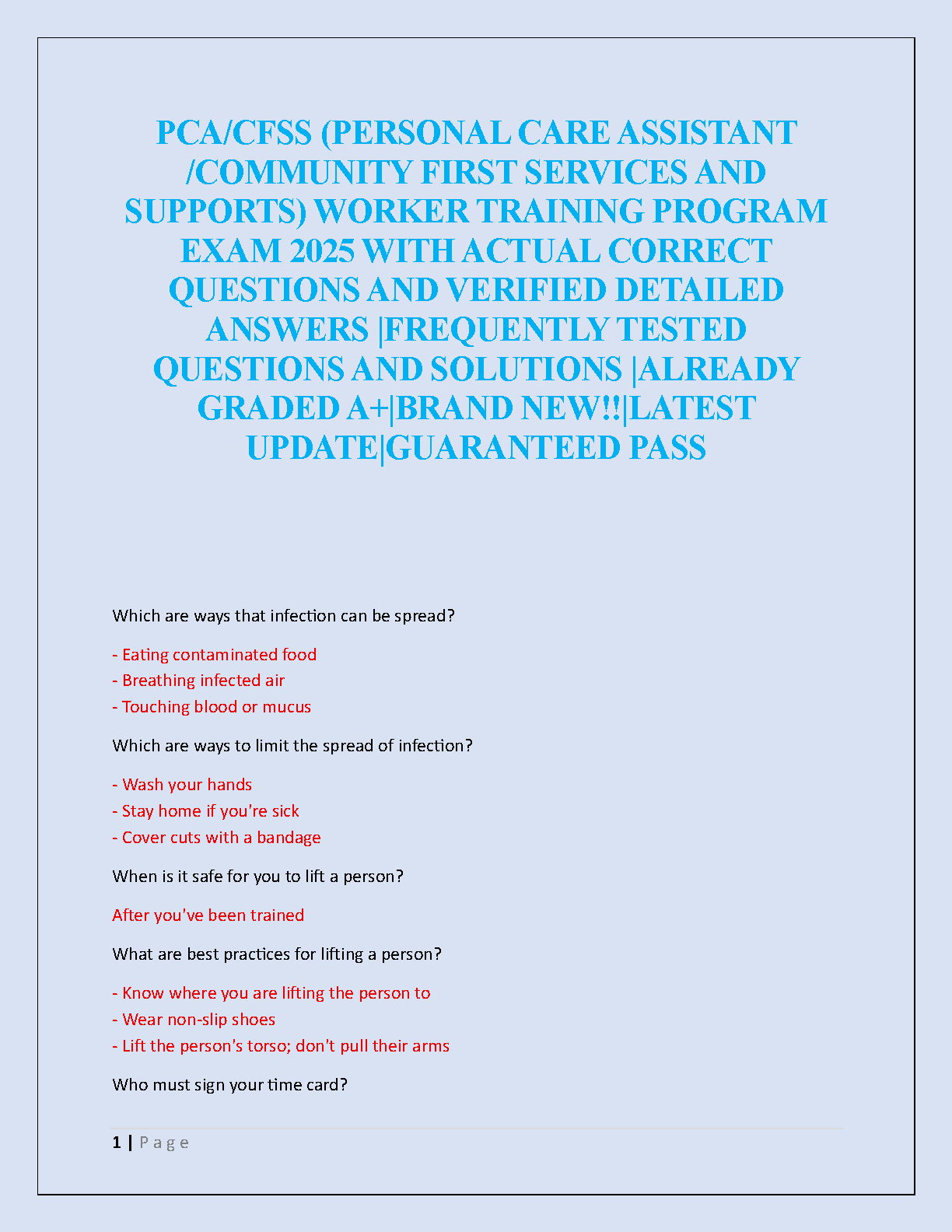 Get ready to ace your Personal Care Assistant certification with our comprehensive test bank for the PCA/CFSS Worker Training Program Exam 2025. This study guide is your ultimate tool for success, featuring a complete collection of frequently tested questions paired with accurate, verified answers. Each question has been carefully selected to reflect the actual exam, ensuring you are fully prepared for topics such as infection control, safe patient lifting practices, and procedural guidelines. Our A+ graded material is designed to help you pass on your first attempt with confidence. Download now to secure your pass and begin your career as a certified PCA!