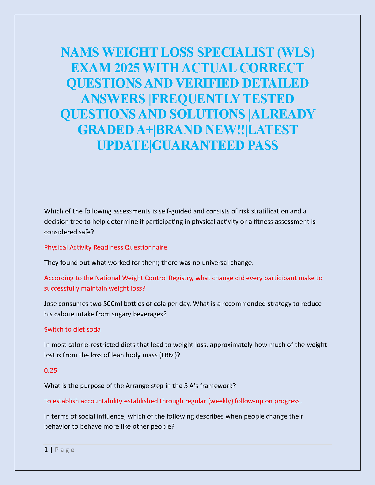 Ace your NAMS Weight Loss Specialist (WLS) certification exam with our comprehensive 2025 test bank. This premium study guide is packed with actual, frequently tested questions and meticulously verified, detailed answers. Each solution is explained to ensure you grasp the core concepts, from client assessment and risk stratification to the psychology of weight loss and effective dietary strategies. Our A+ graded material is your ultimate tool for success, designed to help you pass confidently on your first attempt and launch your career as a certified WLS. Stop stressing and start studying smart with this latest, updated resource for guaranteed results.