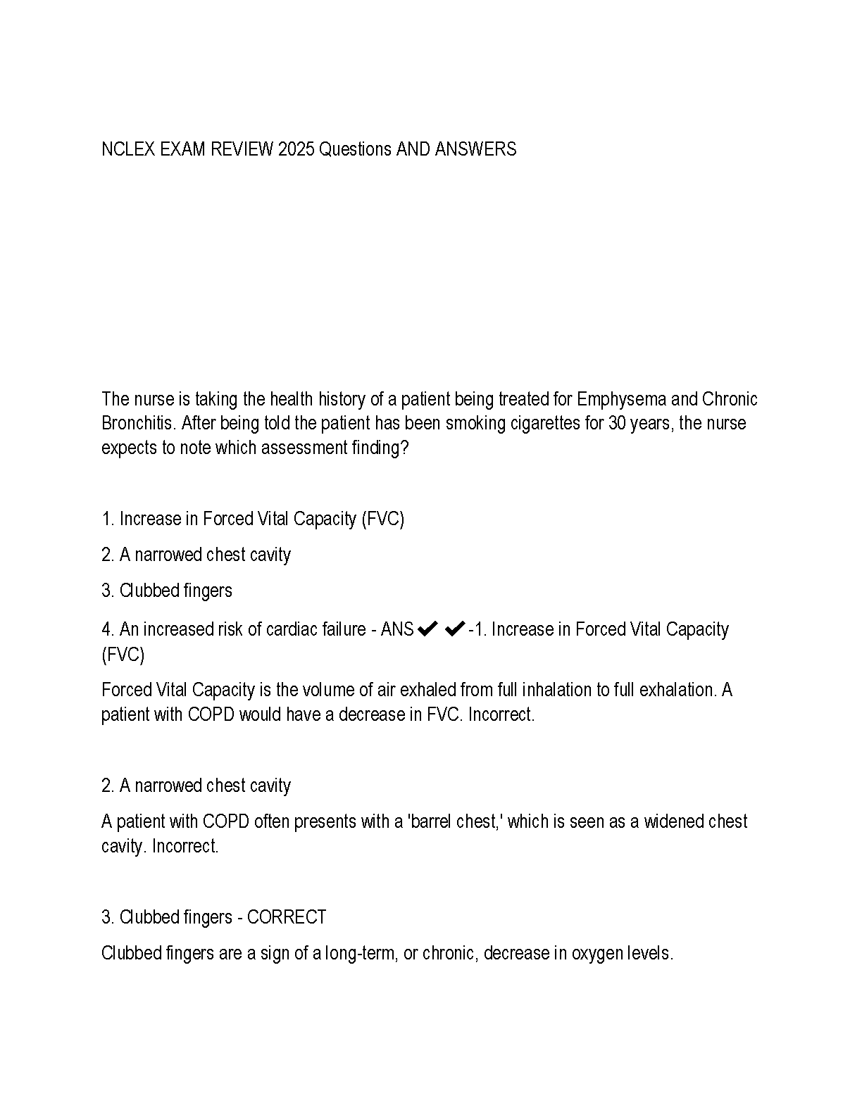 Ace your nursing boards with our latest NCLEX Exam Review for 2025. This comprehensive test bank is packed with practice questions and detailed answers designed to help you succeed on your first attempt. Each question comes with a clear rationale, explaining not only why the correct answer is right but also why the other options are wrong. This study guide is your ultimate tool to master key nursing concepts, boost your confidence, and pass the NCLEX-RN or NCLEX-PN exam, ensuring you avoid costly resits. Get ready for the 2025/2026 academic year with this essential resource.