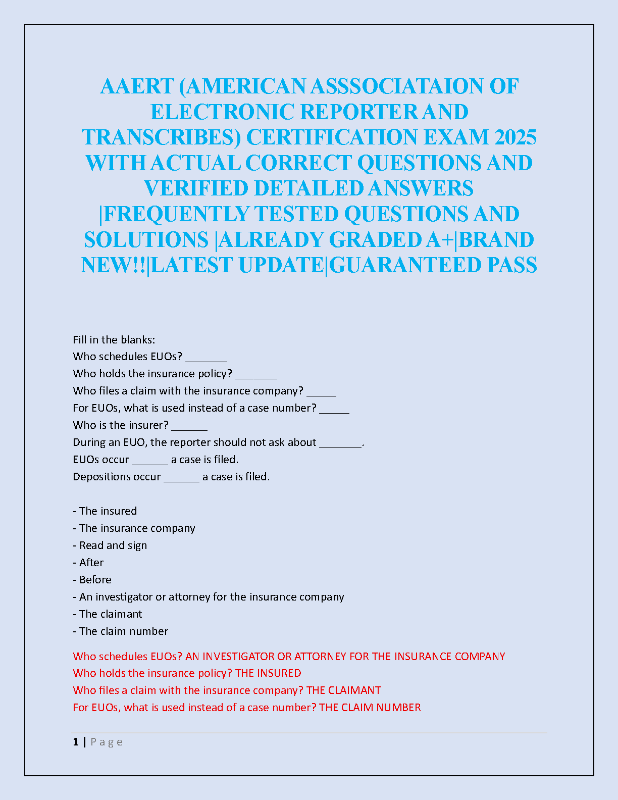 Ace your 2025 AAERT Certification Exam with our comprehensive test bank, meticulously prepared for aspiring professionals by the American Association of Electronic Reporters and Transcribers. This up-to-date study guide features a complete collection of actual, frequently tested questions paired with verified, detailed answers and solutions. Achieve an A+ grade and guarantee your success on the first try. Our resource is the ultimate tool for aspiring electronic reporters and transcribers looking to pass their certification exam with confidence. Get the latest update and be fully prepared for success!