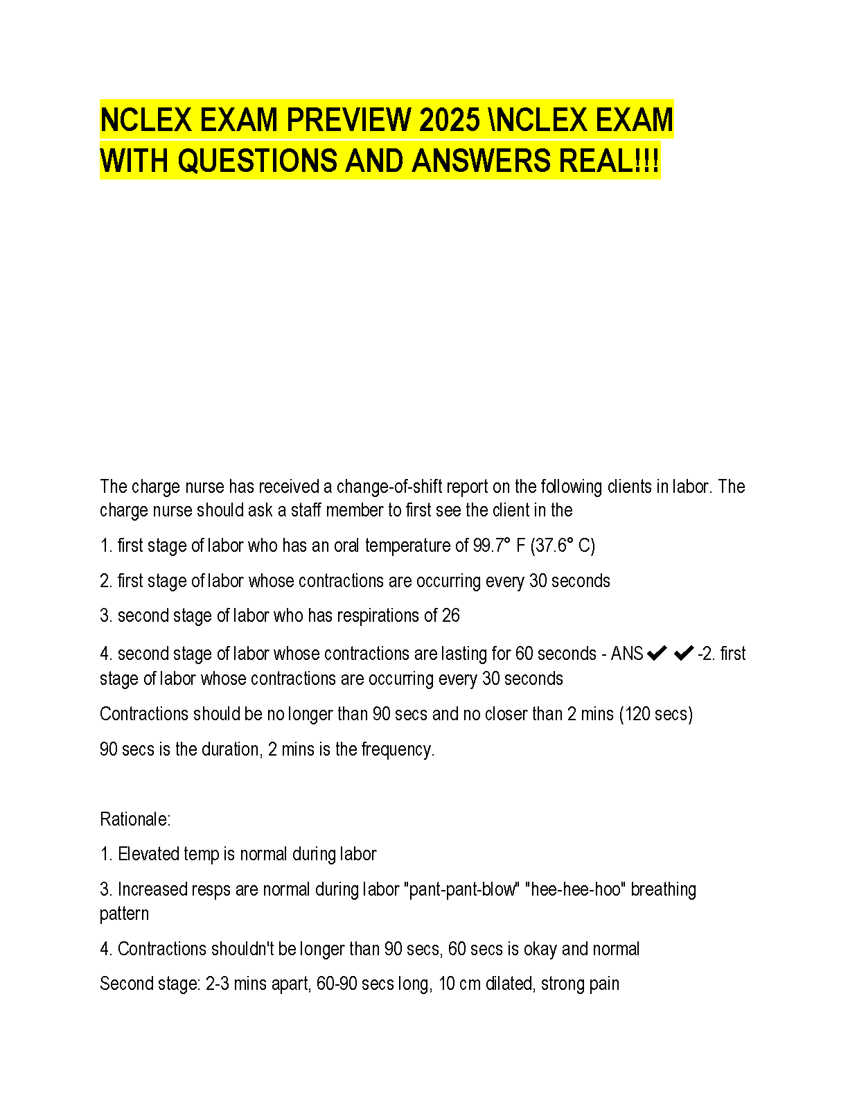 Are you ready to pass the NCLEX on your very first try? This comprehensive study guide for the 2025/2026 academic year is packed with realistic NCLEX-style questions, complete with verified answers and in-depth rationales. Our expertly crafted material is designed to help you master critical thinking skills, understand complex nursing scenarios, and build the confidence you need to succeed. Avoid the stress of resits by preparing with the most up-to-date and relevant content available. Get the edge you need to ace your nursing boards and start your career with confidence!