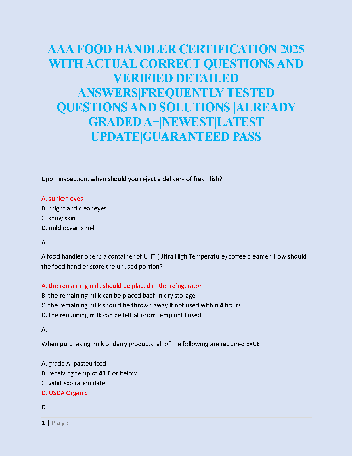 Ace your food handler certification on the first try with our comprehensive Test Bank for the AAA Food Handler 2025 exam. This premium study resource contains a complete collection of the latest, frequently tested questions, each with verified, detailed answers and solutions. Already graded A+, this guide is your key to mastering crucial food safety principles and ensuring a guaranteed pass. Prepare confidently with the most accurate and up-to-date material available and earn your certification without the stress of resits.