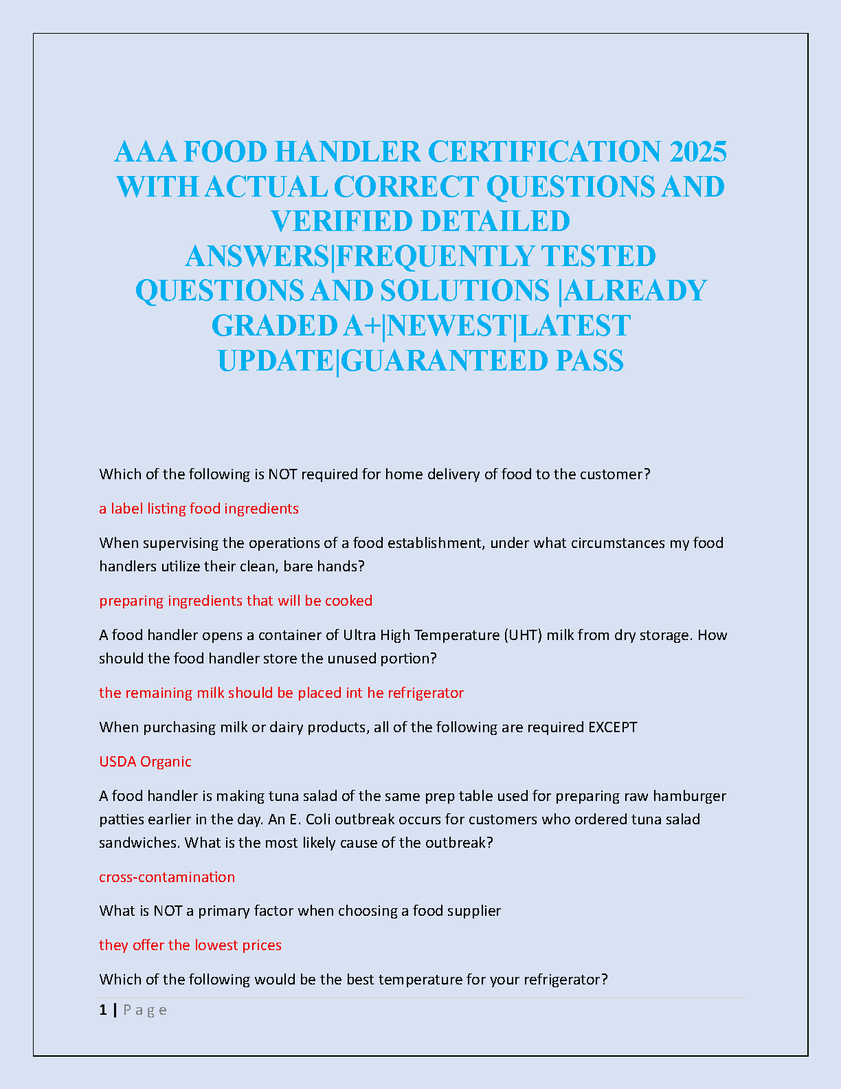 Unlock success in your food handling career with our latest 2025 AAA Food Handler Certification Test Bank. This comprehensive resource is packed with actual exam questions and meticulously verified, detailed answers, covering all essential topics for the 2025 certification. Designed to help you pass on your very first attempt, this guide provides A+ graded solutions to frequently tested questions. Avoid the stress of resits by mastering key concepts like proper food storage, preventing cross-contamination, supplier selection, and more. Get the latest, most up-to-date material and gain the confidence you need to ace your certification exam!