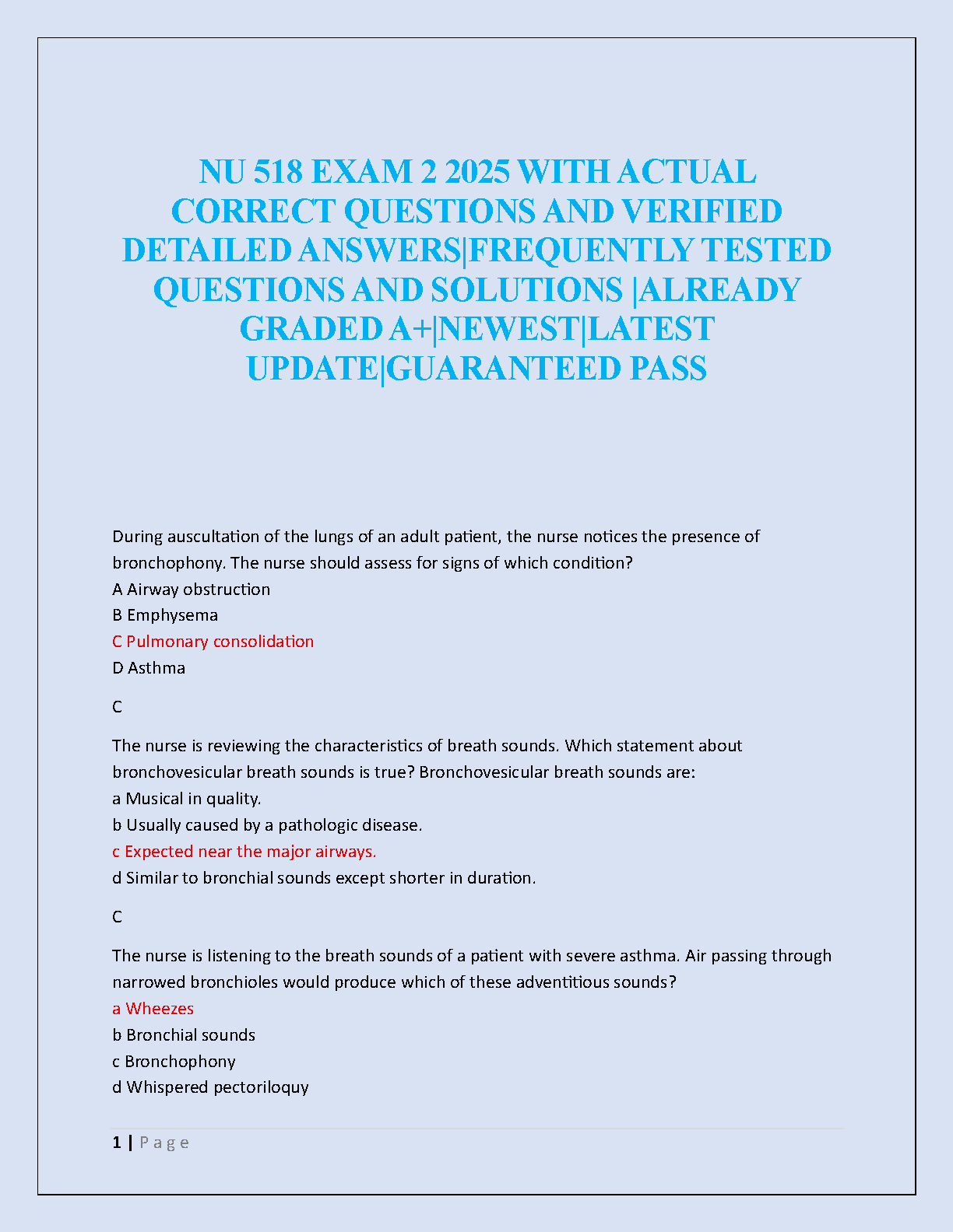 Achieve top marks on your upcoming NU 518 Exam 2 with this comprehensive test bank for the 2025/2026 academic year. This essential study resource features a collection of actual, frequently tested exam questions, each accompanied by a verified, detailed answer and solution. Designed to help you master key concepts in advanced health assessment, this guide ensures you are fully prepared to tackle the exam with confidence. Forget exam stress and avoid resits! Our A+ graded material provides the clarity and practice you need to pass on your first attempt. Download now and secure your path to success in NU 518.