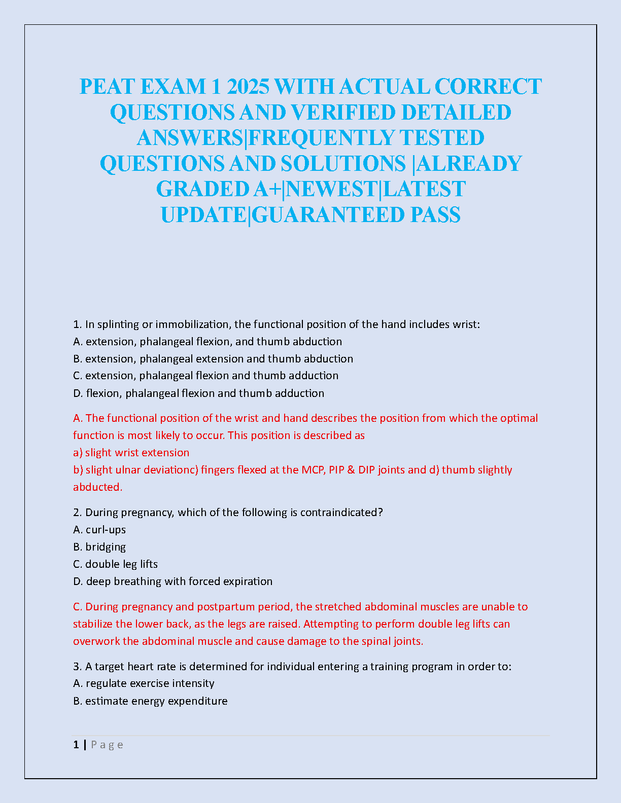 Prepare to ace the National Physical Therapy Examination (NPTE) with our comprehensive 2025 Test Bank for the PEAT Exam 1. Authored by the Federation of State Boards of Physical Therapy (FSBPT), the PEAT is the official practice exam, and this guide provides you with a collection of actual, frequently tested questions, complete with verified answers and detailed rationales. This A+ graded resource covers essential topics and is designed to help you master the material, study effectively, and pass your board exam on the first attempt. Get the latest updated questions and solutions to guarantee your success.