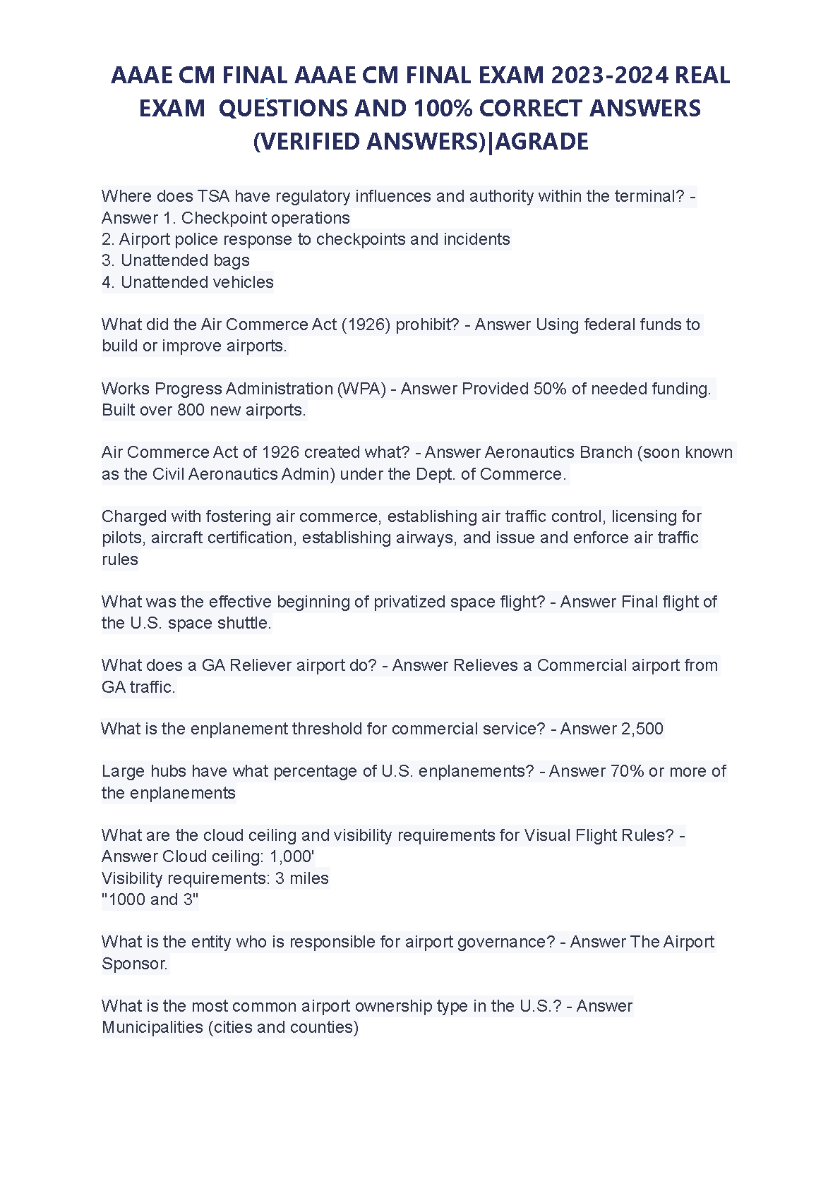 Ace your AAAE Certified Member (CM) Final Exam with our ultimate 2024-2025 test bank! This comprehensive resource is loaded with real exam questions and 100% correct, verified answers, meticulously compiled to ensure you pass on your very first attempt. Our guide covers all critical topics, including TSA authority, airport governance, the Air Commerce Act, Visual Flight Rules (VFR), and more. Eliminate exam anxiety and confidently secure your A+ grade. Download now to fast-track your career in airport management!