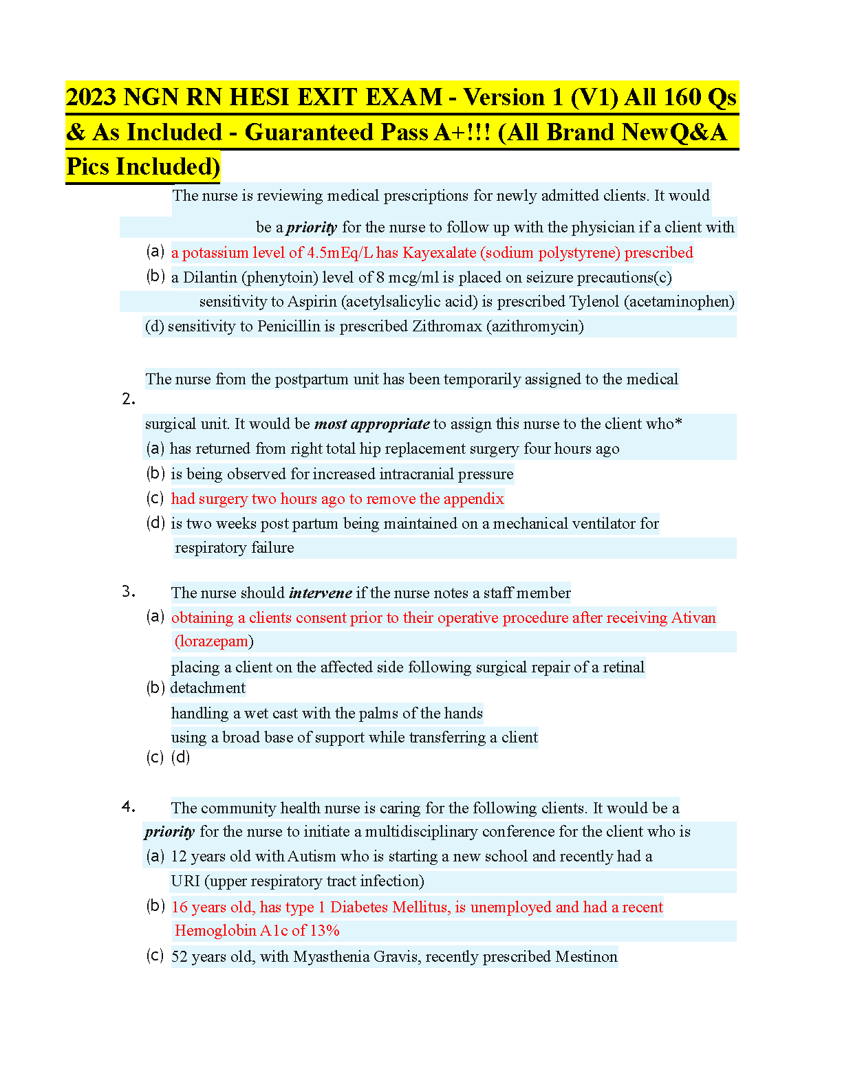 Ace your HESI RN Exit Exam on the very first attempt! This comprehensive test bank for 2025/2026 provides the complete Version 1 (V1) of the Next Generation HESI RN Exit Exam. It includes all 160 meticulously crafted questions with detailed answers, perfectly mirroring the actual exam format. This study guide is your ultimate tool to master critical nursing concepts, avoid resits, and pass with confidence. Prepare effectively for the NGN style and take the final step towards your nursing career.