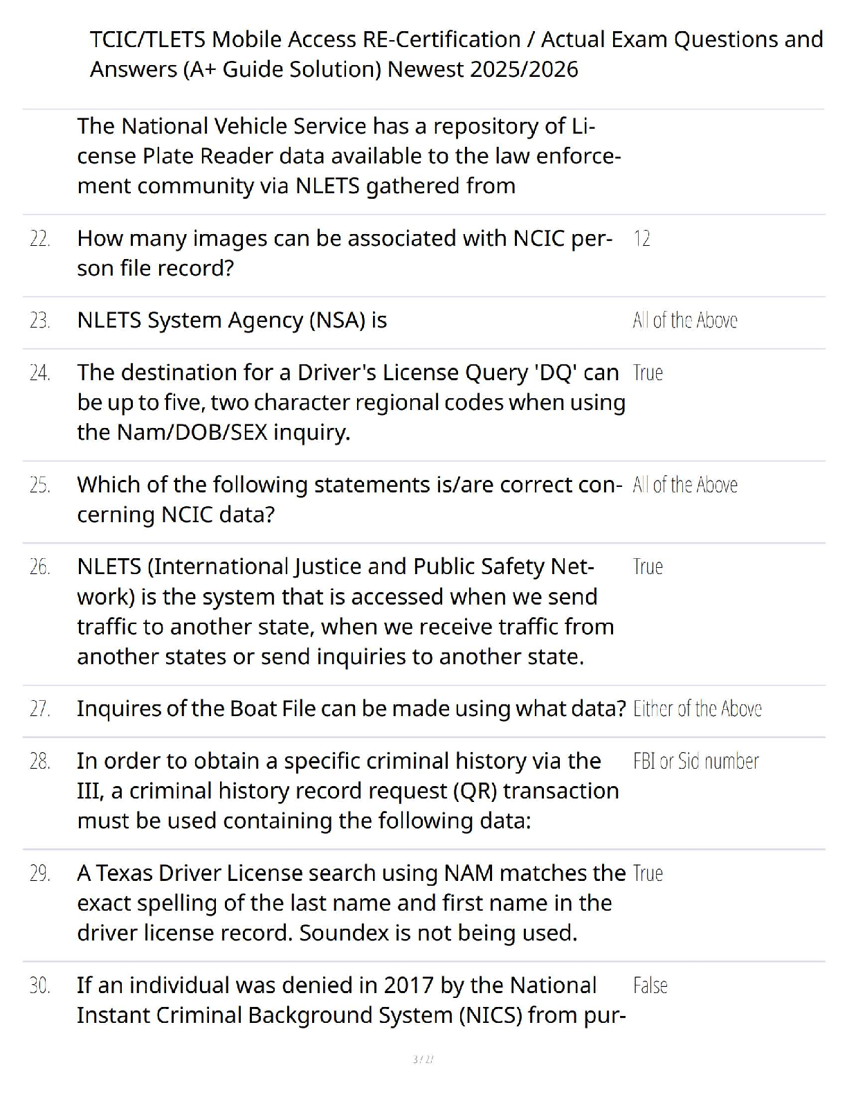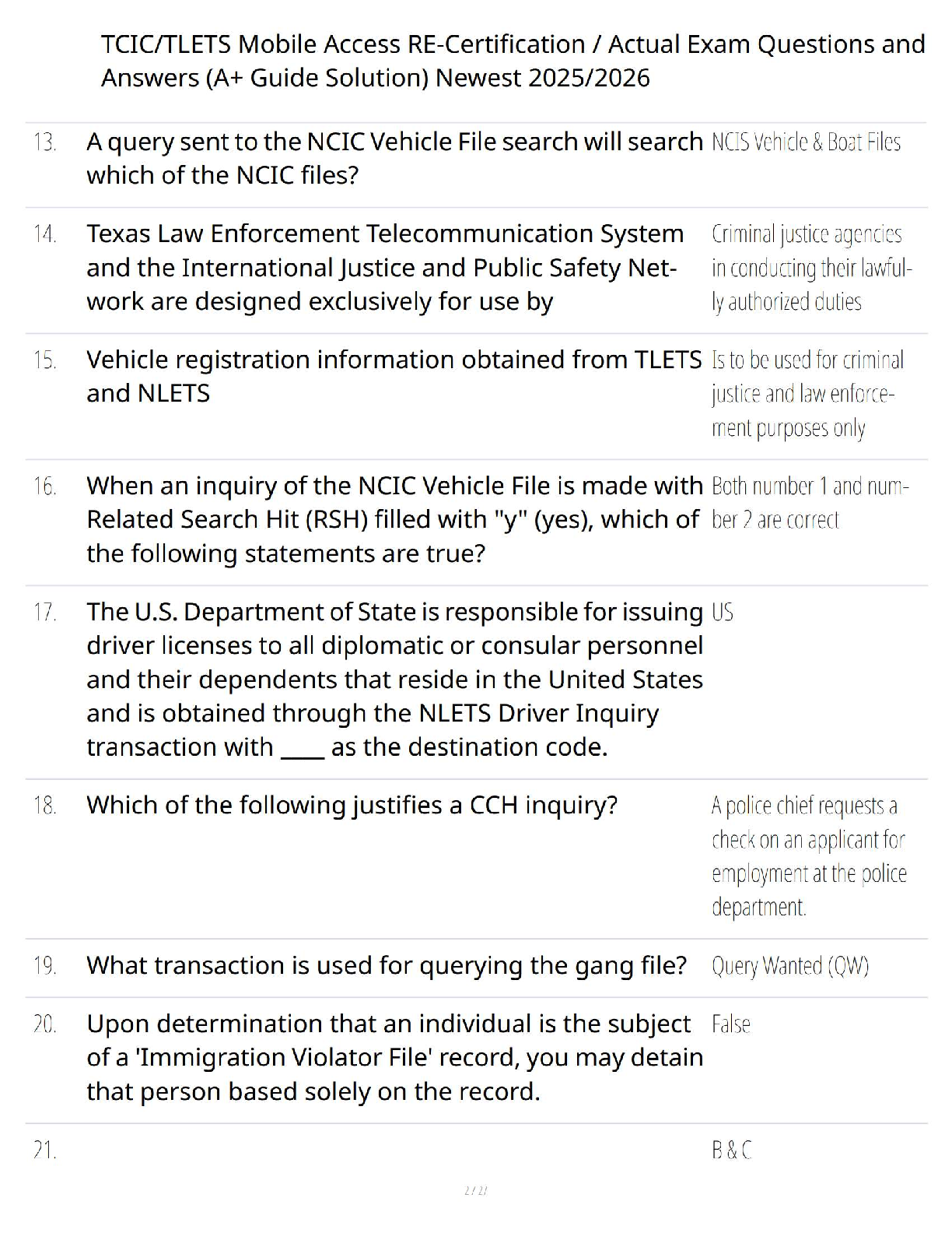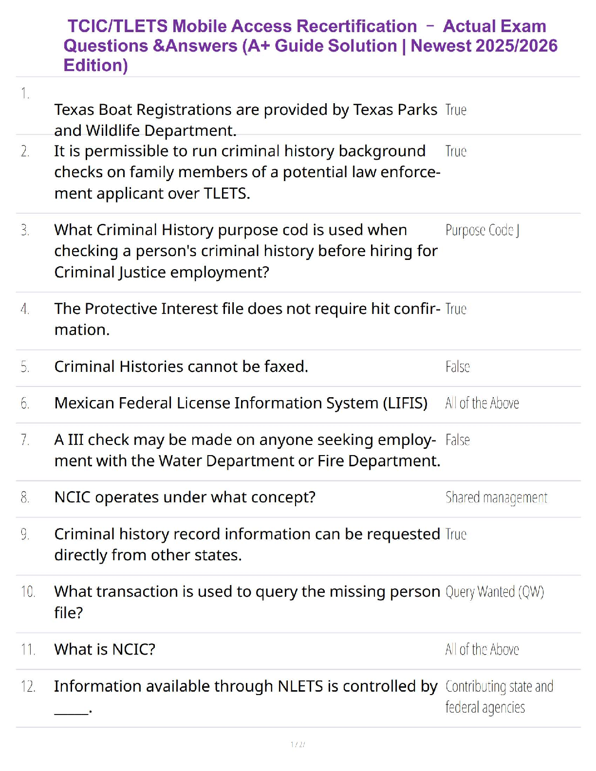 Get ready to ace your TCIC/TLETS Mobile Access Recertification exam with our comprehensive study guide for the 2025/2026 testing cycle. This A+ rated resource provides a complete set of actual exam questions paired with verified, accurate answers. Master key concepts related to the Texas Crime Information Center (TCIC), Texas Law Enforcement Telecommunication System (TLETS), NCIC, and NLETS. Our solution guide is meticulously designed to cover all essential topics, ensuring you have the knowledge and confidence to pass your certification on the very first attempt. Download now for immediate access and start your path to a successful recertification.