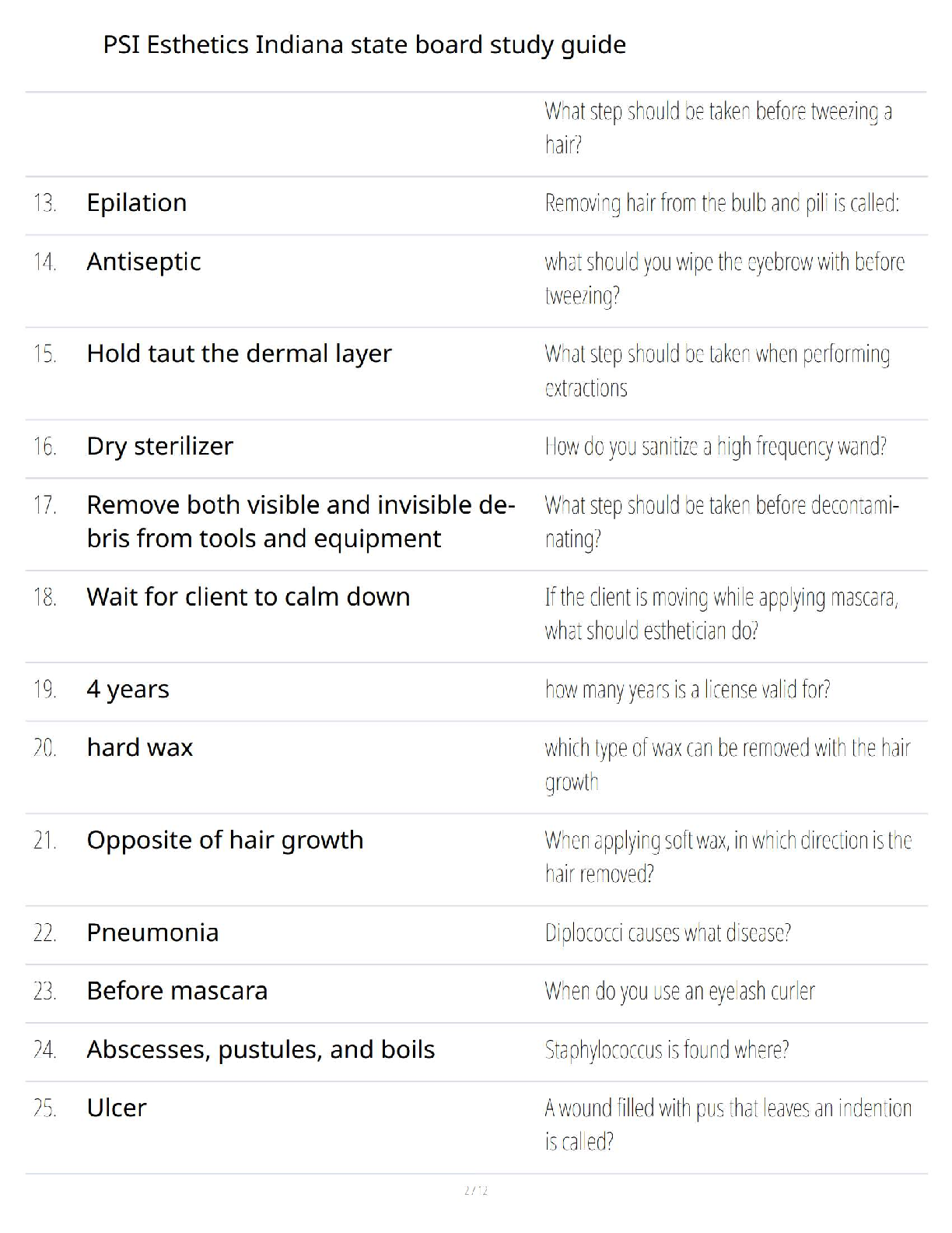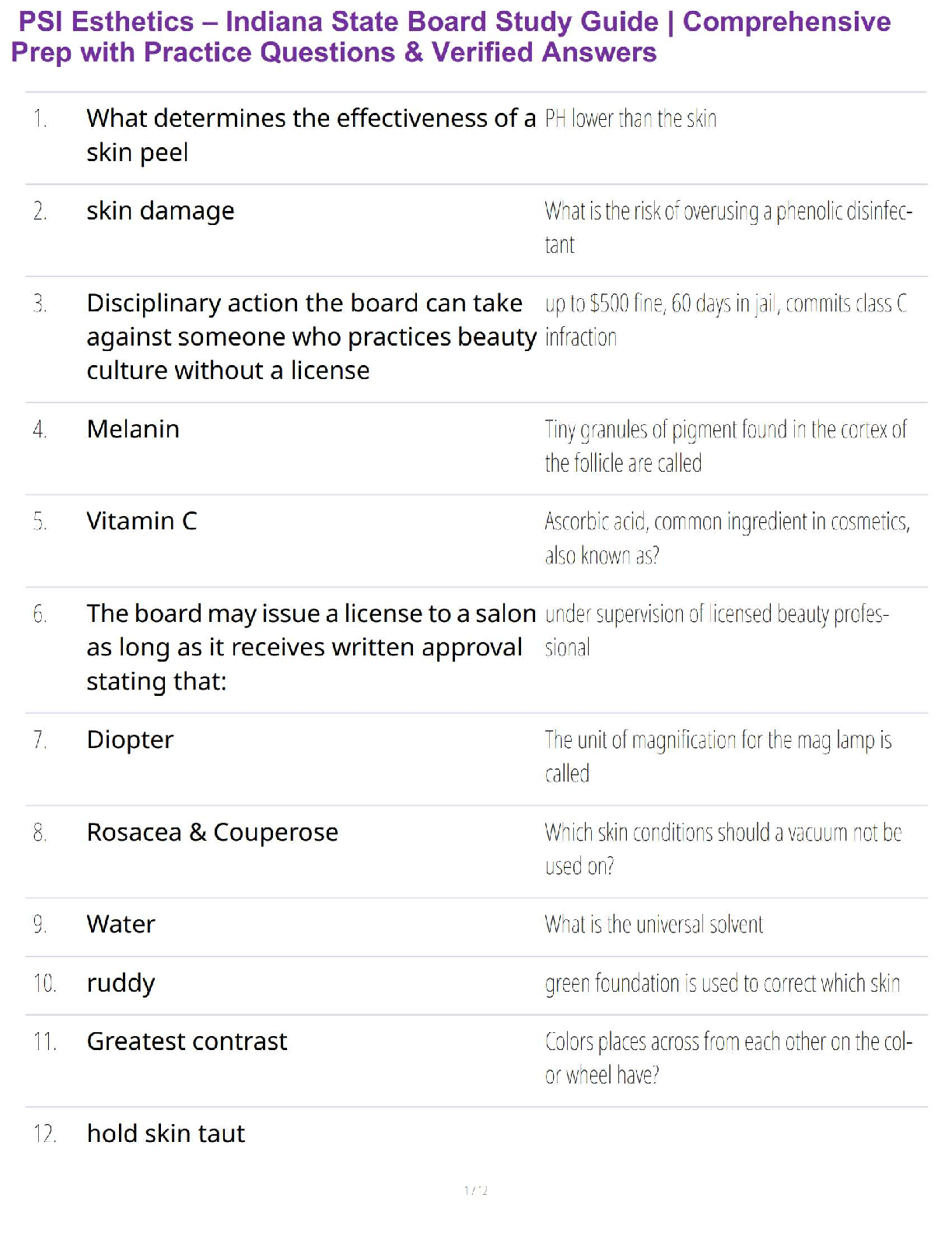 Ace your PSI Esthetics Indiana State Board exam on the very first try with our ultimate 2025/2026 study guide! This comprehensive test bank is expertly crafted to give you the edge you need. It features a complete collection of practice questions paired with 100% accurate and verified answers, covering all essential topics from skin science and safety to state regulations and client services. Stop worrying about resits and start your career with confidence. Download now to access the most up-to-date and reliable prep material for your Indiana esthetician license.