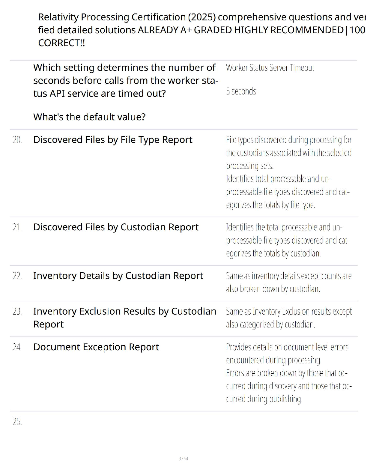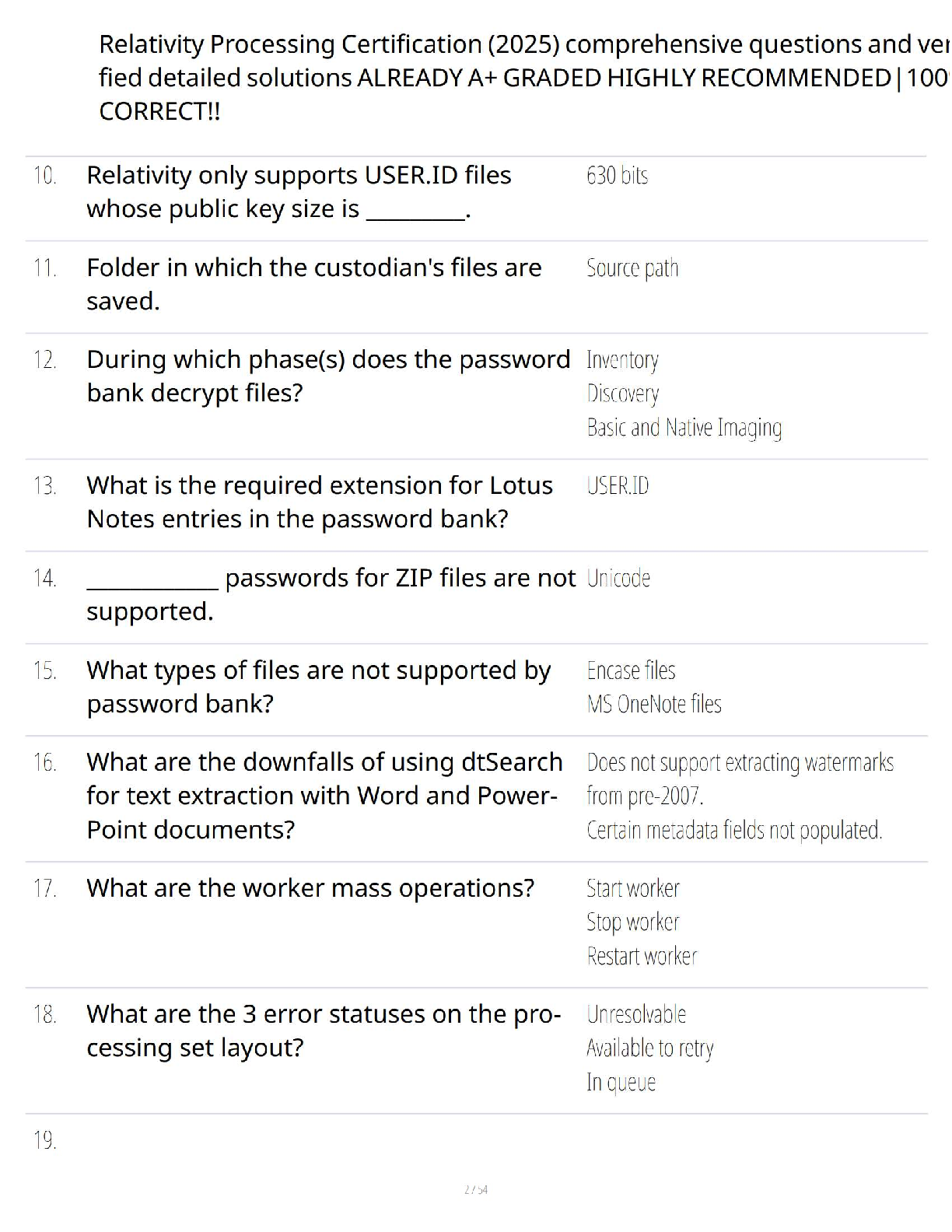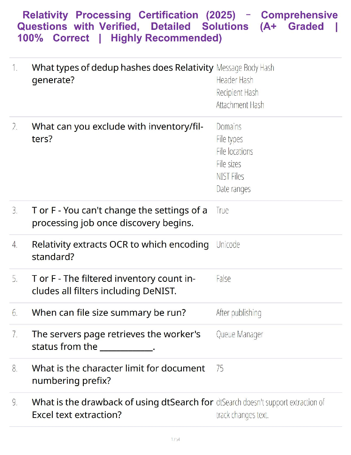 Ace your Relativity Processing Certification exam with our latest 2025 Test Bank. This comprehensive resource is packed with verified questions and detailed, 100% correct answers, designed to help you pass on your very first attempt. Covering all key topics from dedup hashes and inventory filters to OCR standards and dtSearch limitations, this A+ graded guide is your ultimate tool for success. Avoid resits and master the material with our highly recommended study solution.