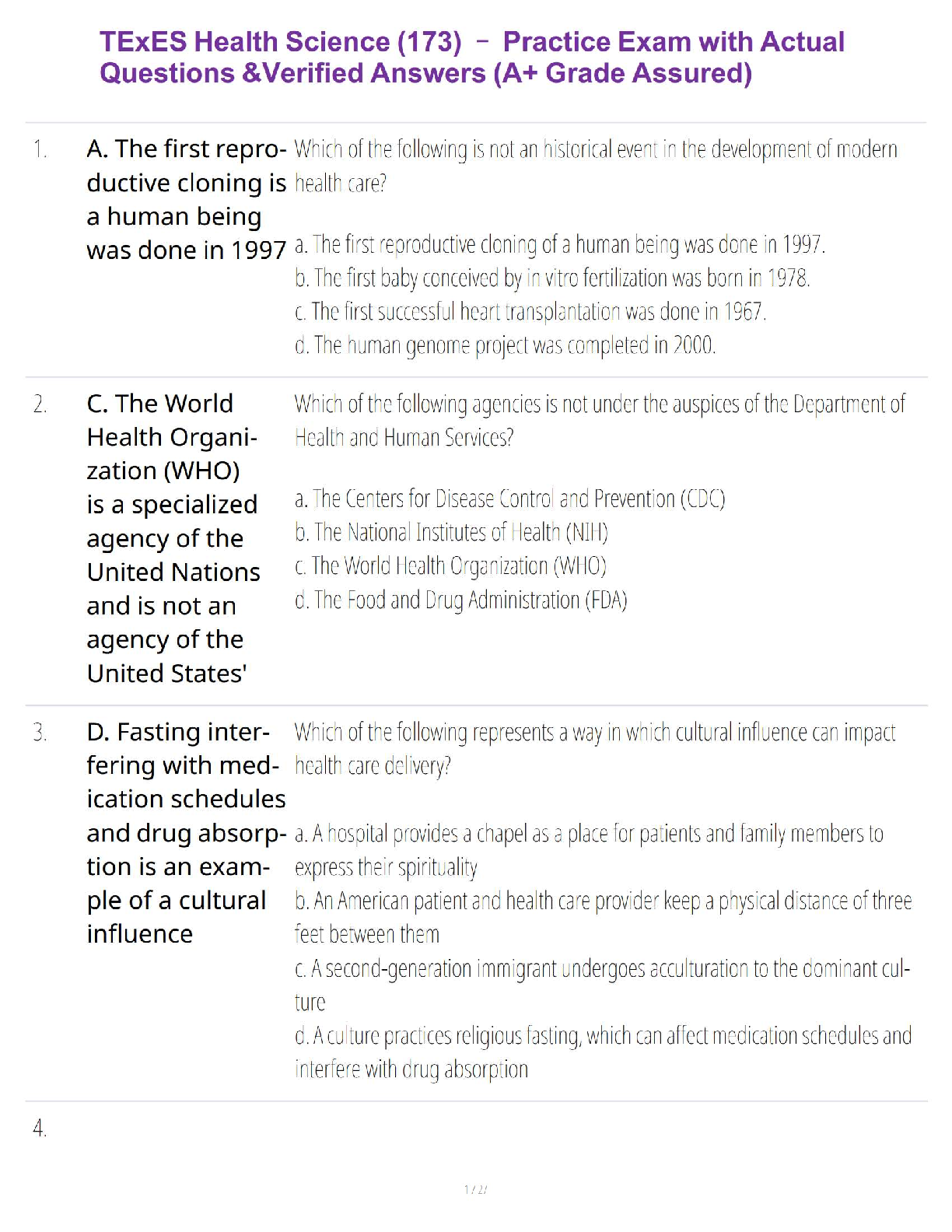 Excel on your TExES Health Science (173) exam with our premier test bank, featuring a robust collection of actual exam questions and verified, in-depth answers. This study guide is expertly designed to help you master key concepts, build confidence, and achieve an A+ grade. Prepare effectively to pass your certification on the first try and avoid costly resits. Your path to becoming a certified Health Science teacher in Texas starts here!