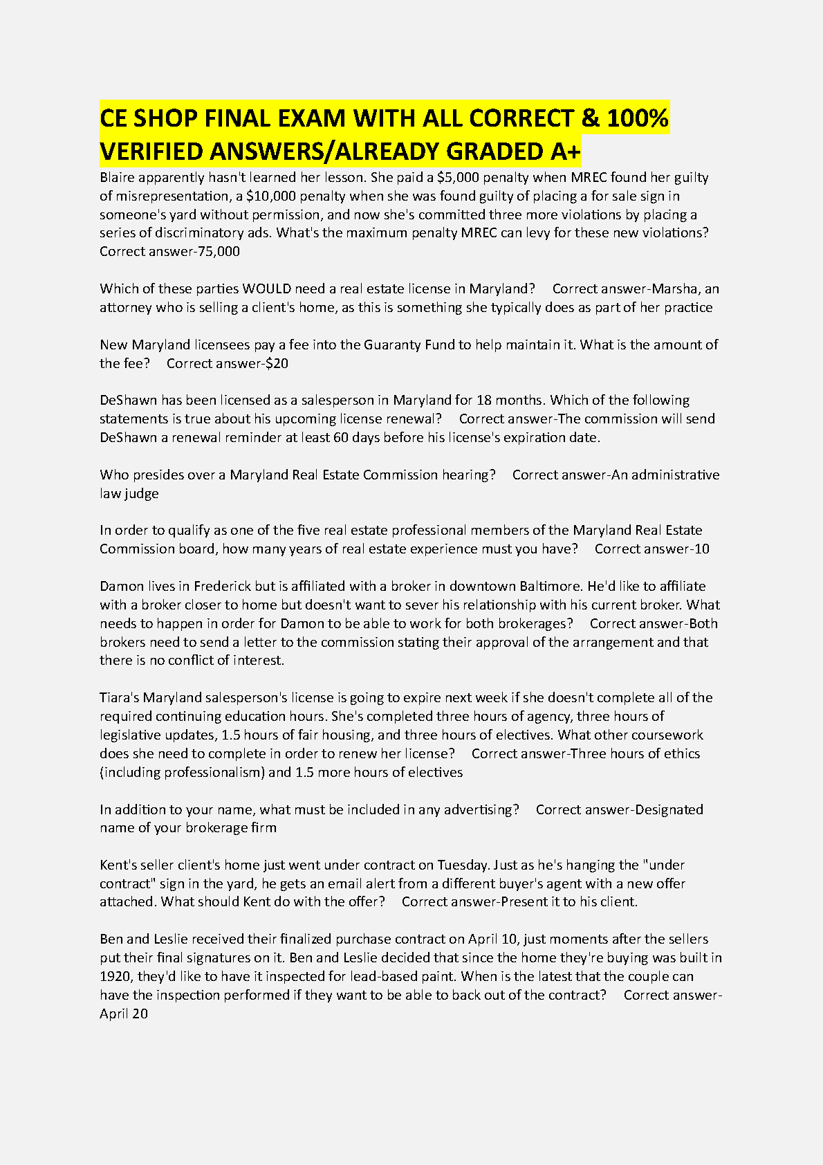 The CE Shop Maryland Real Estate Final Exam Test Bank (2025/2026 Edition): A+ Graded Q&A for First-Attempt Success