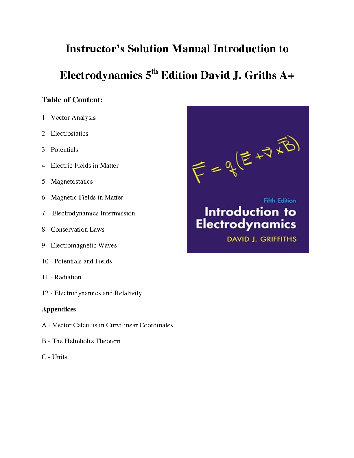 Unlock a deeper understanding of physics with the official Instructor's Solution Manual for 'Introduction to Electrodynamics, 5th Edition' by Griffiths and Schroeter. This comprehensive resource provides detailed, step-by-step solutions to all end-of-chapter problems, covering key topics such as Vector Analysis, Electrostatics, Magnetostatics, and Electromagnetic Waves. It is the ultimate study aid for students seeking to master complex concepts, check their homework accuracy, and thoroughly prepare for exams to achieve top grades.