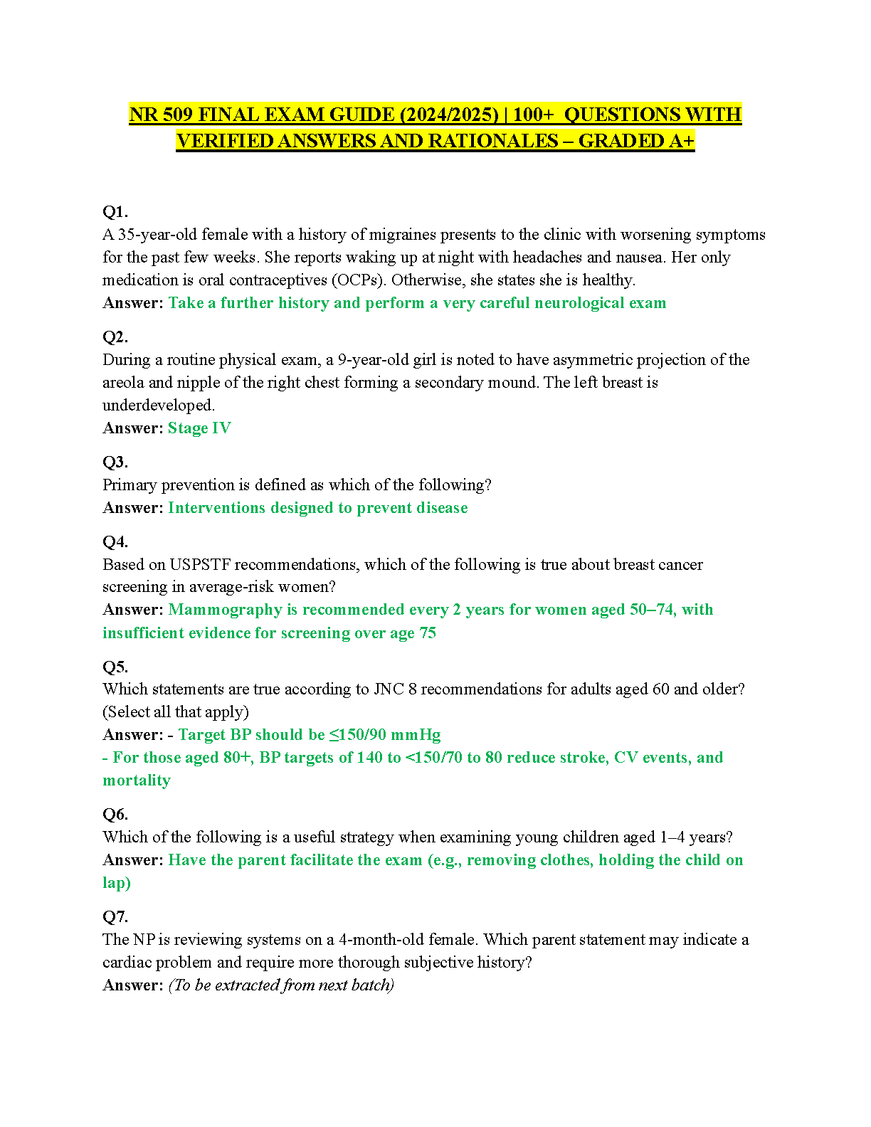 Master your NR 509 Advanced Physical Assessment final exam with this complete 2024-2025 test bank. This comprehensive study guide includes over 100 practice questions, each paired with a verified answer and a detailed rationale to ensure a deep understanding of the concepts. Covering all essential topics from the NR 509 curriculum, this resource is expertly designed to help you prepare effectively, build confidence, and secure an A+ grade on your final examination.