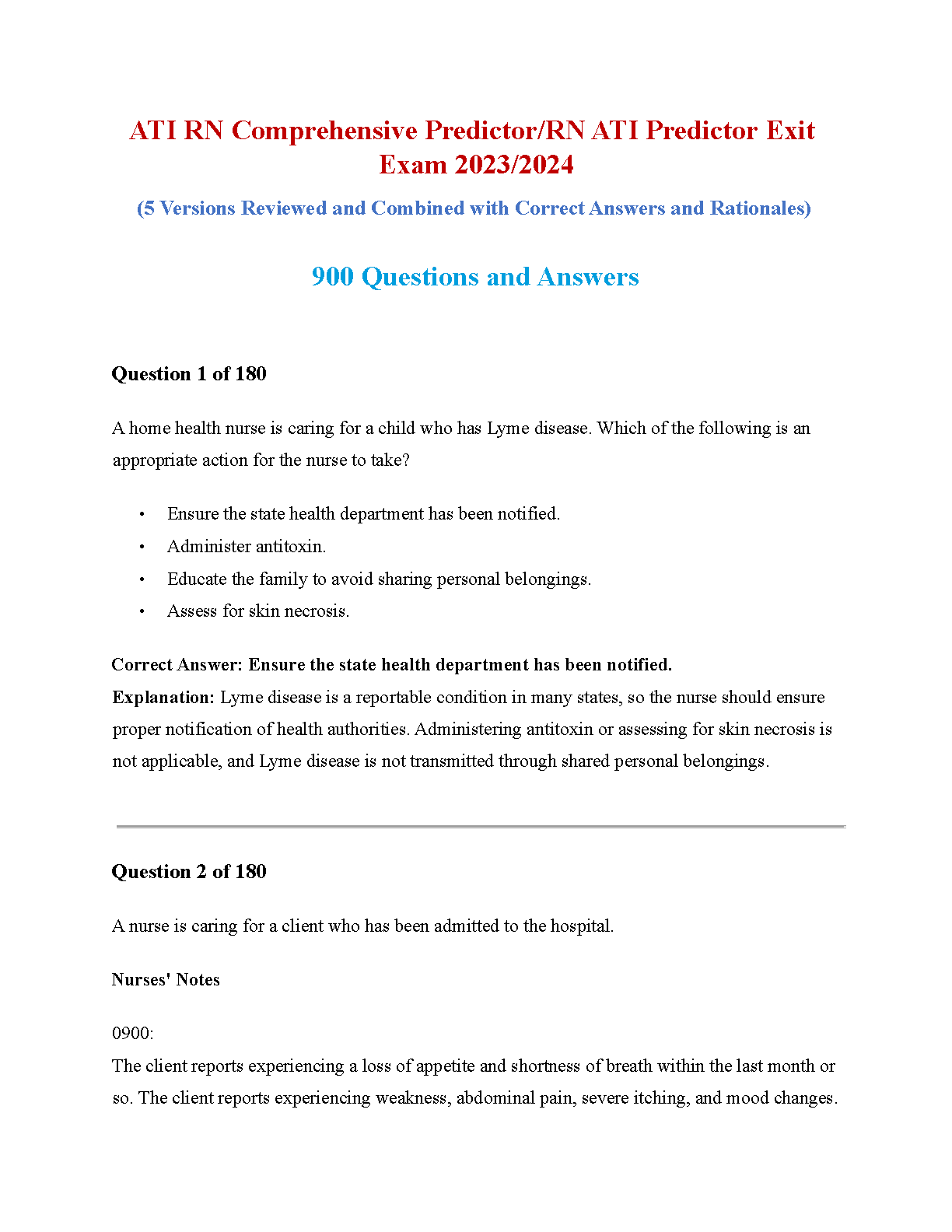 Get fully prepared for your nursing boards with our latest 2025/2026 ATI RN Comprehensive Predictor Exit Exam Test Bank. This essential study guide, developed by ATI Nursing Education, is your key to success. It features a massive collection of over 900 questions and answers, compiled from 5 different reviewed versions of the exam. Each question comes with a detailed, verified rationale to help you understand the core concepts, not just memorize answers. This comprehensive resource is designed to mirror the actual exam, building your confidence and ensuring you pass on your first try. Avoid resits and step into your nursing career with confidence!