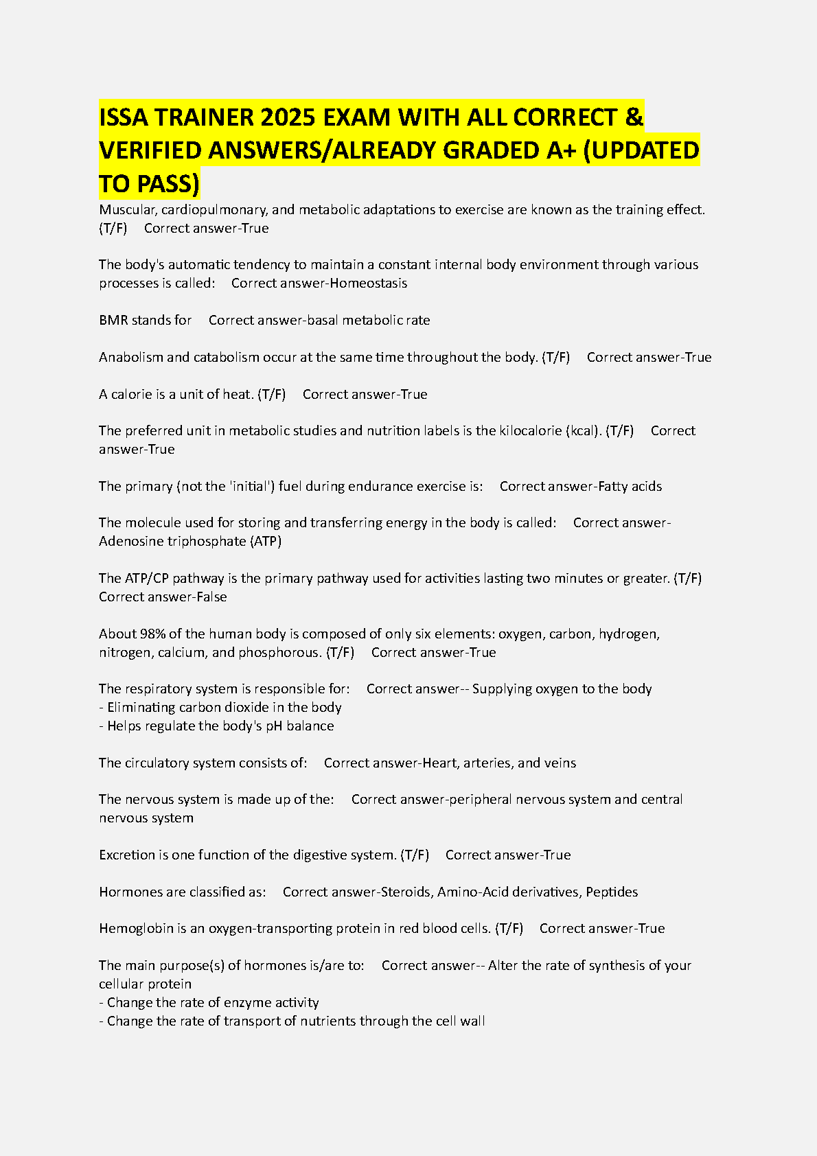 Unlock your potential and guarantee your success on the ISSA Certified Personal Trainer (CPT) exam with our comprehensive 2025 Test Bank. This essential study resource provides a complete set of questions paired with 100% correct, verified answers, already graded A+. Dive deep into critical topics including metabolism, human anatomy, exercise physiology, energy systems, and more. Designed to mirror the actual exam format, this guide is your key to mastering the material, boosting your confidence, and passing your certification on the very first try. Don't leave your career to chance—prepare with the best and become an ISSA CPT in 2025!