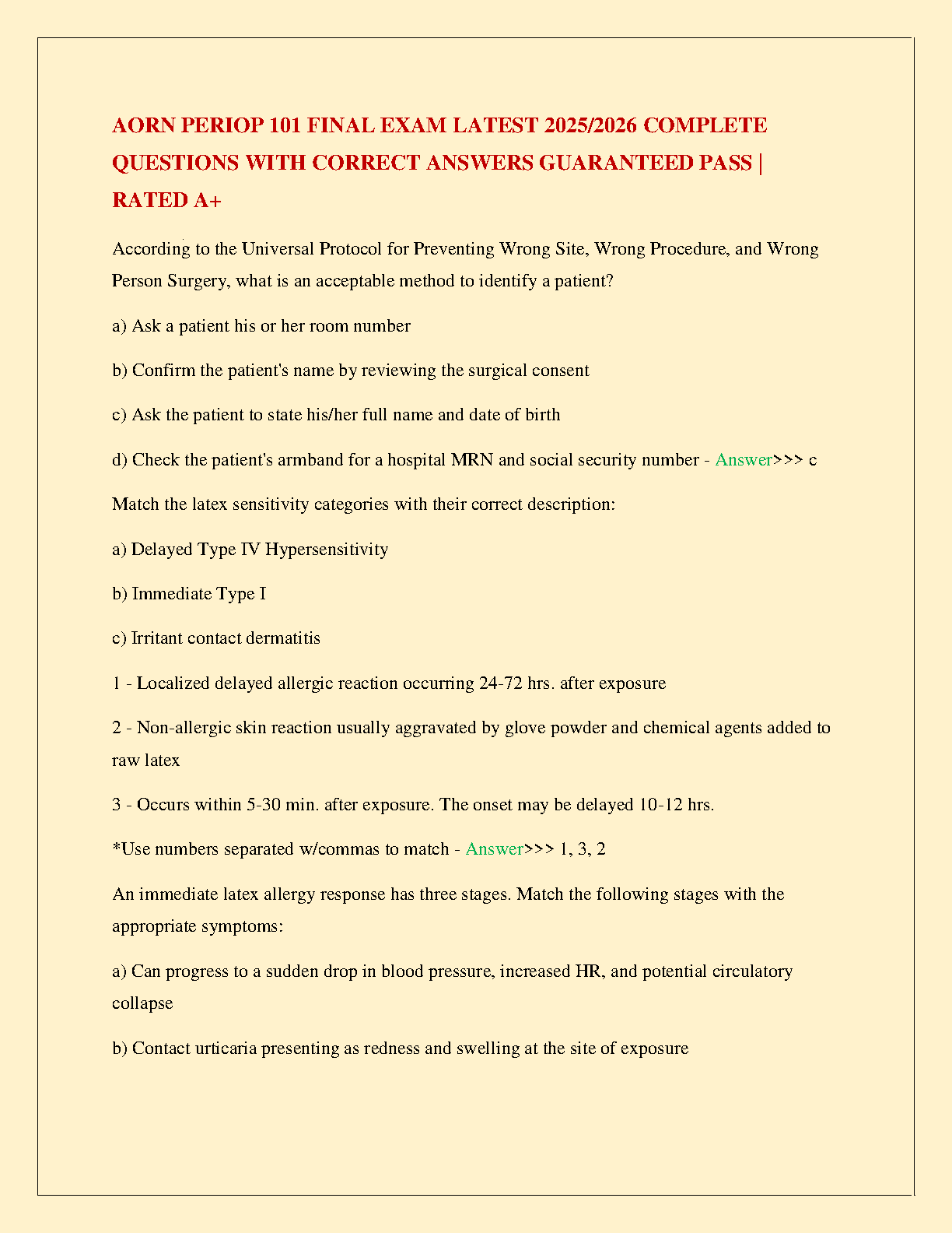 Master the essentials of perioperative nursing and excel in your AORN Periop 101 Final Exam with our newly updated 2025/2026 Test Bank. This premium study resource provides a comprehensive collection of exam questions paired with verified, 100% correct answers. Designed to help you study smarter, not harder, this guide covers all critical topics, ensuring you are fully prepared to pass on your first attempt and achieve an A+ grade. Stop stressing about resits and secure your success today with this essential tool for any aspiring perioperative nurse.