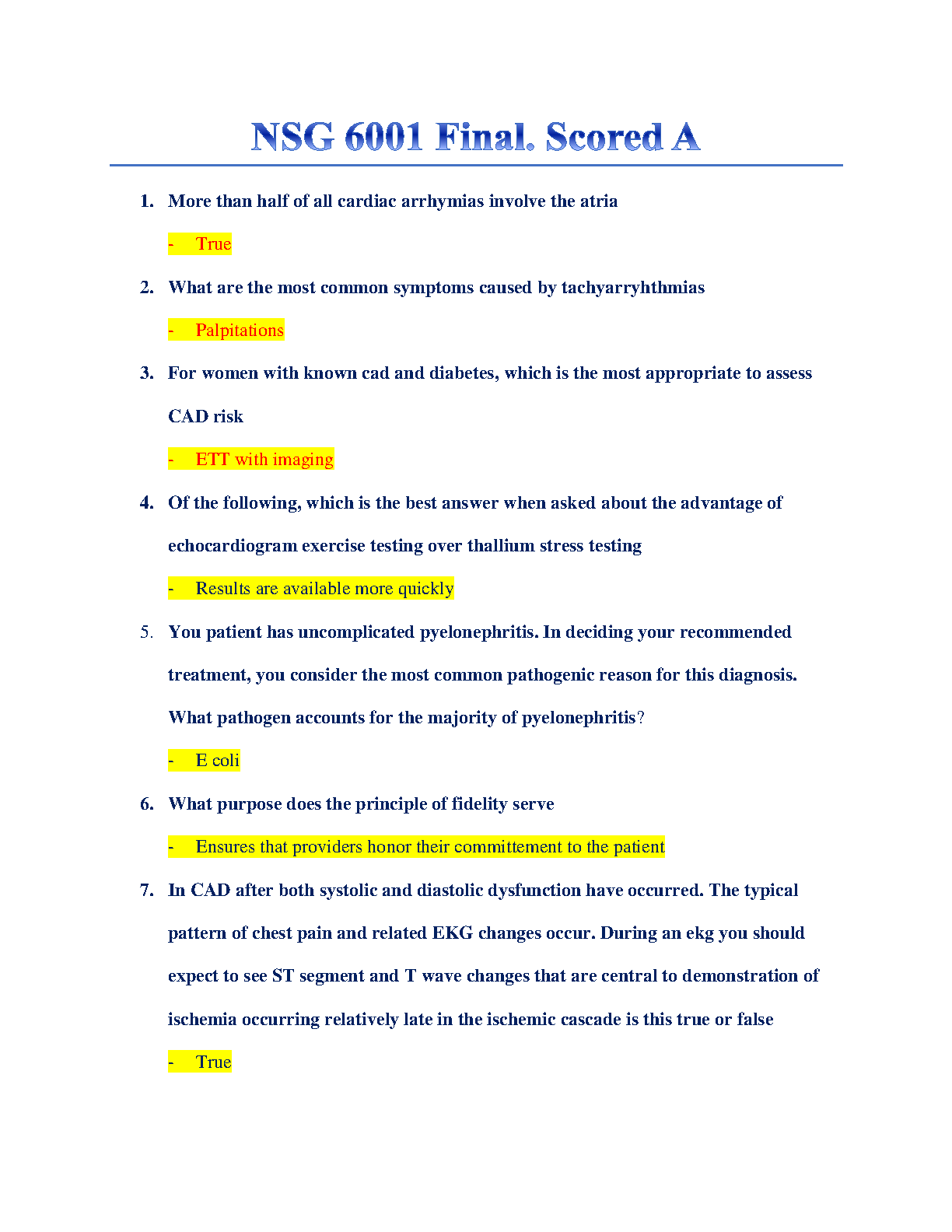 Ace your NSG 6001 final exam with this ultimate study guide for the 2025/2026 academic year. This resource is based on a real exam that scored an A, providing you with a comprehensive set of meticulously verified questions and 100% correct answers. Master key topics including cardiac care, tachyarrhythmias, CAD risk assessment, pyelonephritis, and more. Designed to help you understand complex concepts and pass your final exam with confidence on the very first try. Avoid resits and secure your top grade with this essential study companion.
