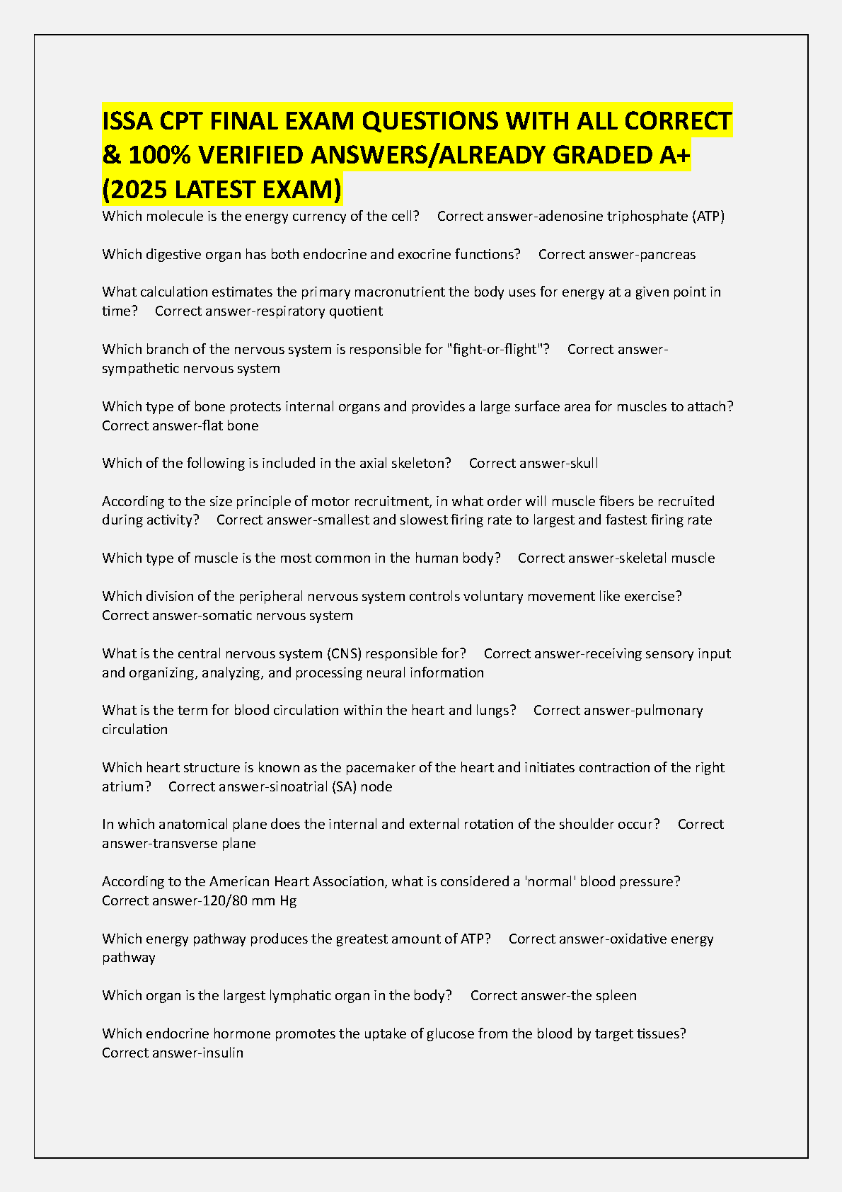 Unlock your potential and secure your ISSA CPT certification with our premier 2025 test bank. This comprehensive resource is packed with the latest final exam questions, each accompanied by a 100% correct and verified answer. Designed to help you achieve an A+ grade, this study guide covers all critical topics, from human anatomy and physiology to bioenergetics. Prepare confidently, master the material, and pass your ISSA CPT final exam on the very first try. Don't leave your success to chance – get the ultimate study partner today!