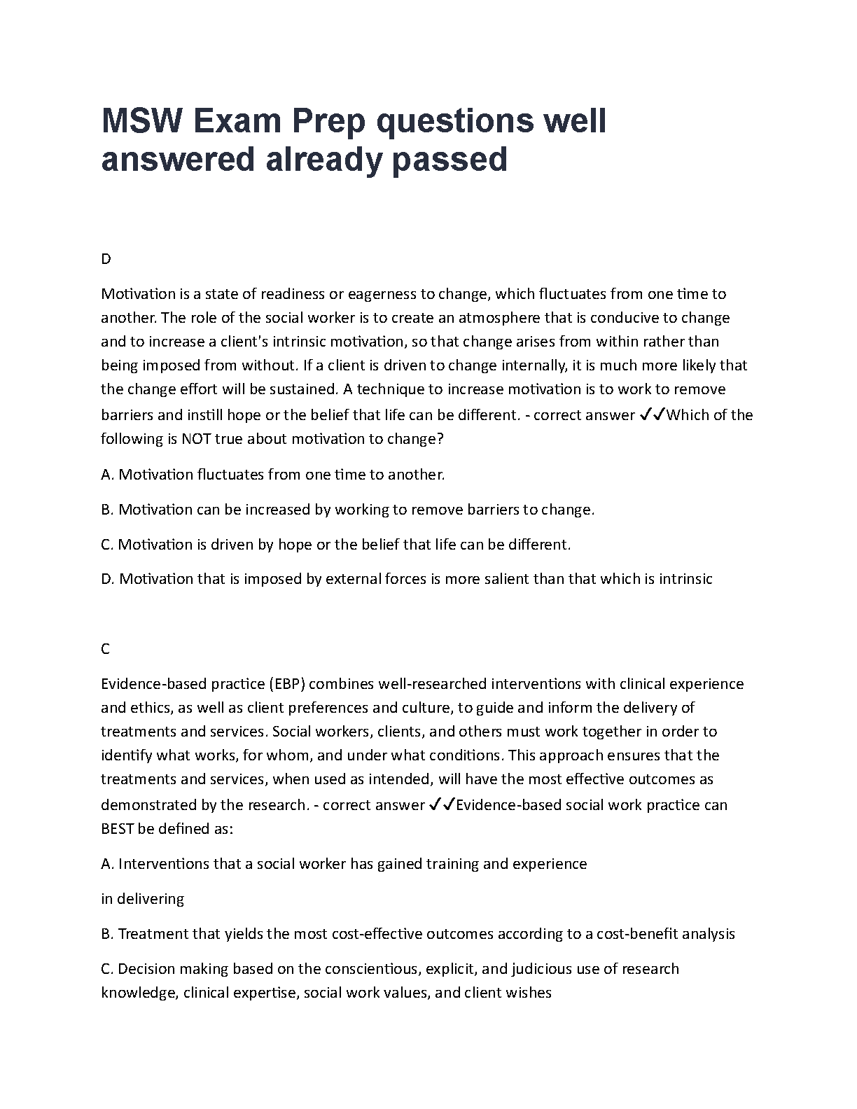Unlock success on your ASWB MSW exam with our latest 2025/2026 Test Bank. This essential study resource provides a comprehensive collection of exam-style questions, complete with verified answers and in-depth explanations. Master crucial social work concepts, including motivation and evidence-based practice, to build your confidence. Designed to help you pass on your first try, this guide is your key to avoiding resits and achieving your MSW license.