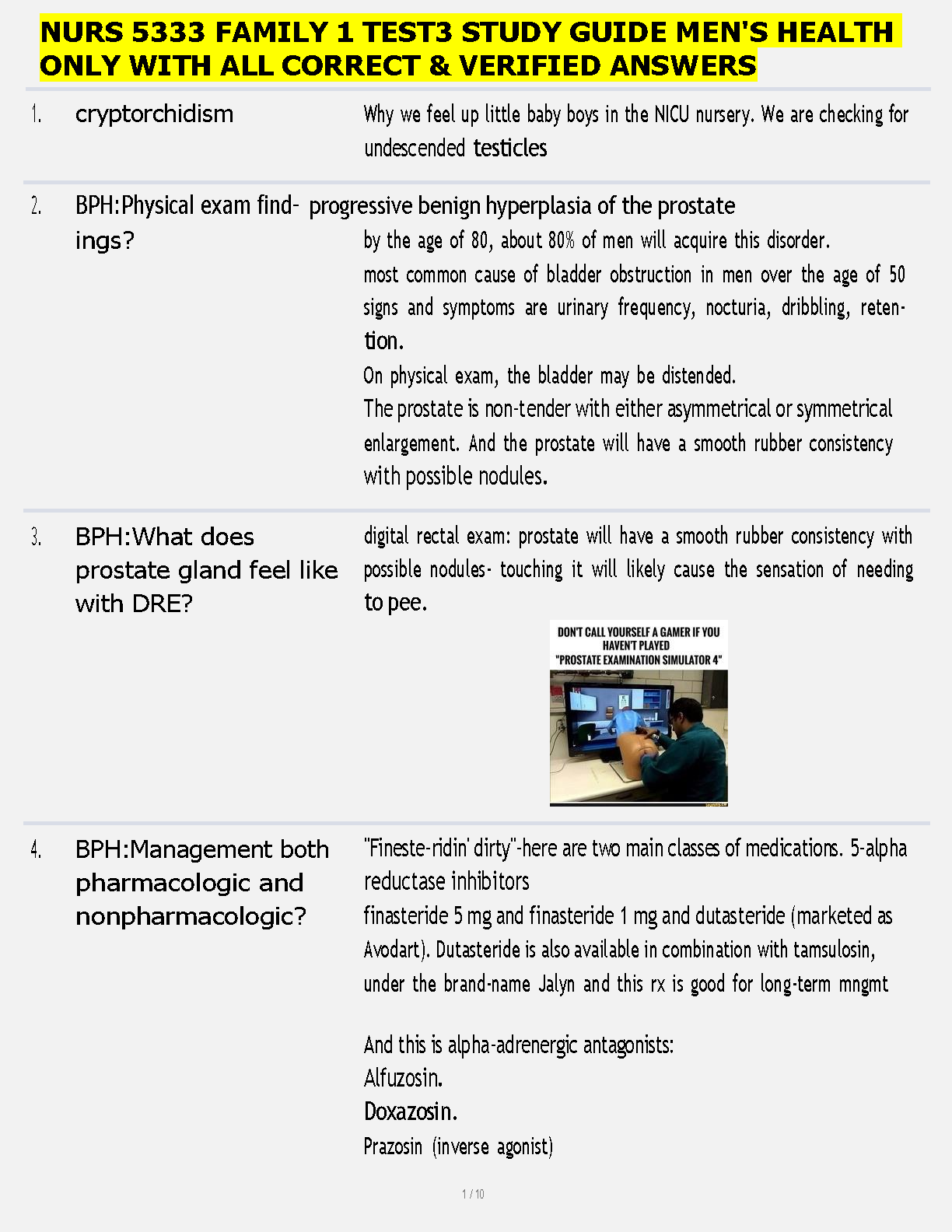 Ace your NURS 5333 Family 1 Test 3 on Men's Health with our meticulously crafted 2025/2026 study guide. Designed for first-attempt success, this resource provides verified, in-depth answers to crucial exam questions. Master key topics such as cryptorchidism, Benign Prostatic Hyperplasia (BPH) diagnostics, physical exam findings, Digital Rectal Exam (DRE) results, and effective pharmacologic and nonpharmacologic treatments. Eliminate exam stress and avoid resits with this ultimate study companion.