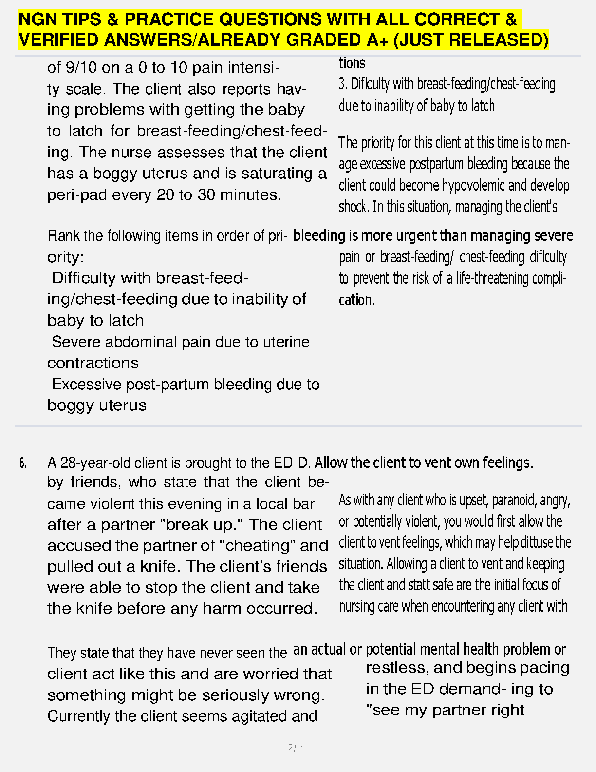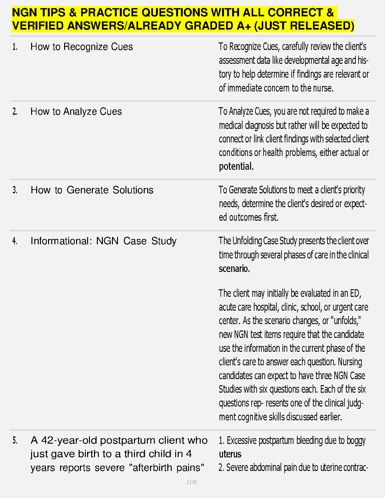 Master the Next Generation NCLEX (NGN) with our brand-new 2025/2026 exam preparation guide. This resource is specifically designed for nursing students who want to pass on their first attempt and avoid resits. It offers a deep dive into crucial NGN skills, including how to recognize and analyze cues, generate solutions, and navigate complex unfolding case studies. The package includes a comprehensive set of practice questions, each with a correct, verified, and A+ graded answer. Get the ultimate study companion to build your confidence and excel in your nursing career.