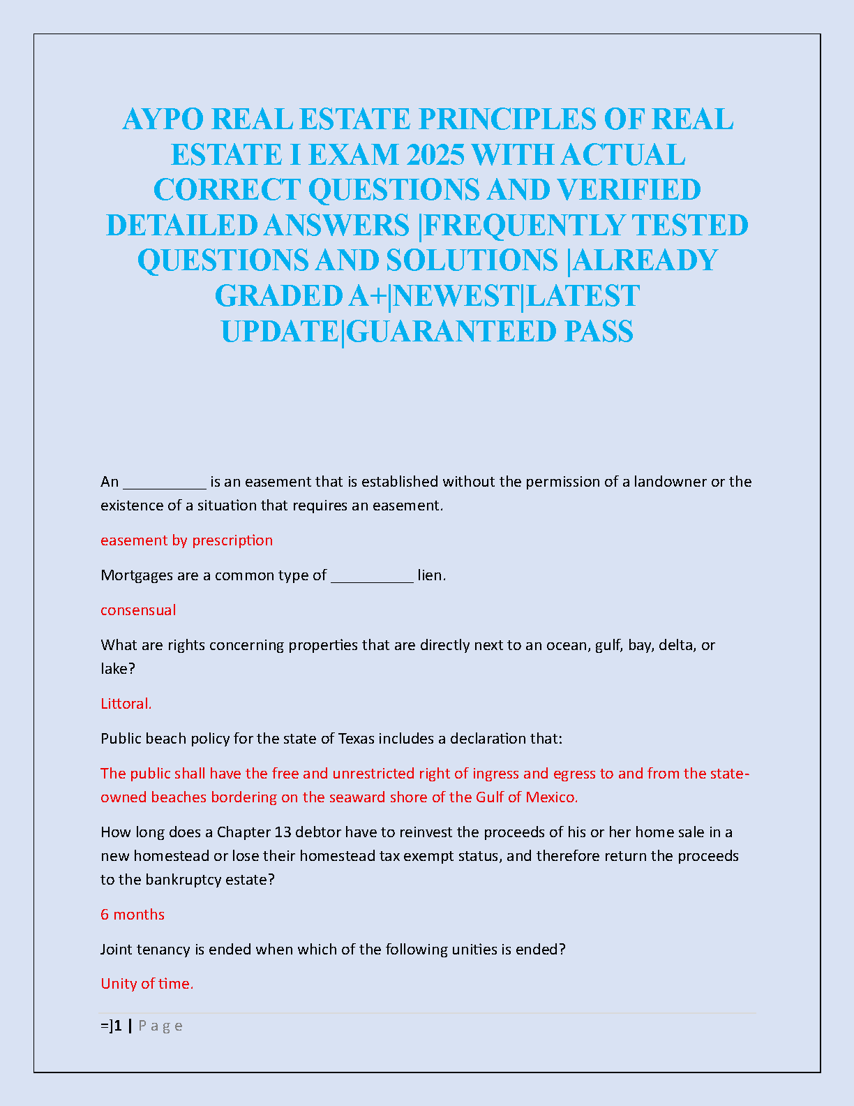 Master the AYPO Principles of Real Estate I exam with our comprehensive 2025 test bank! This is your ultimate study guide, meticulously compiled with the latest, frequently tested questions and verified, detailed answers. Sourced directly from the 2025 course material, this resource is already A+ graded and is designed to help you understand key concepts like easements, liens, and property rights. Stop worrying about resits and pass your real estate exam on the very first try with this guaranteed success tool from At Your Pace Online (AYPO).