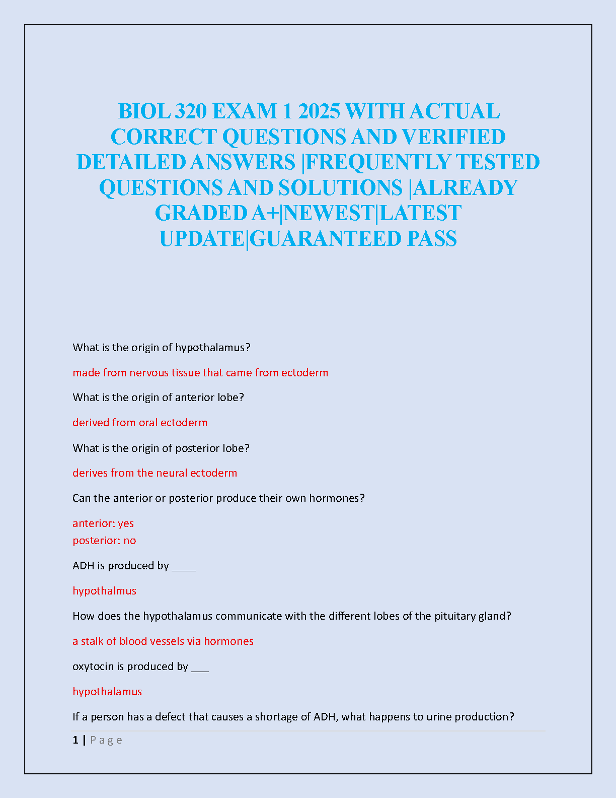 Prepare to ace your BIOL 320 Exam 1 with this comprehensive test bank for the 2025 academic year. This essential study guide features a vast collection of real exam questions, complete with detailed, expert-verified answers. Each solution is crafted to ensure you grasp complex topics, including the endocrine system, the functions of the hypothalamus and pituitary gland, and hormonal regulation. This A+ graded resource is designed to help you study smarter, not harder, giving you the confidence to pass your exam on the very first attempt and avoid costly resits. Get the edge you need for academic success with our latest BIOL 320 Exam 1 study material.