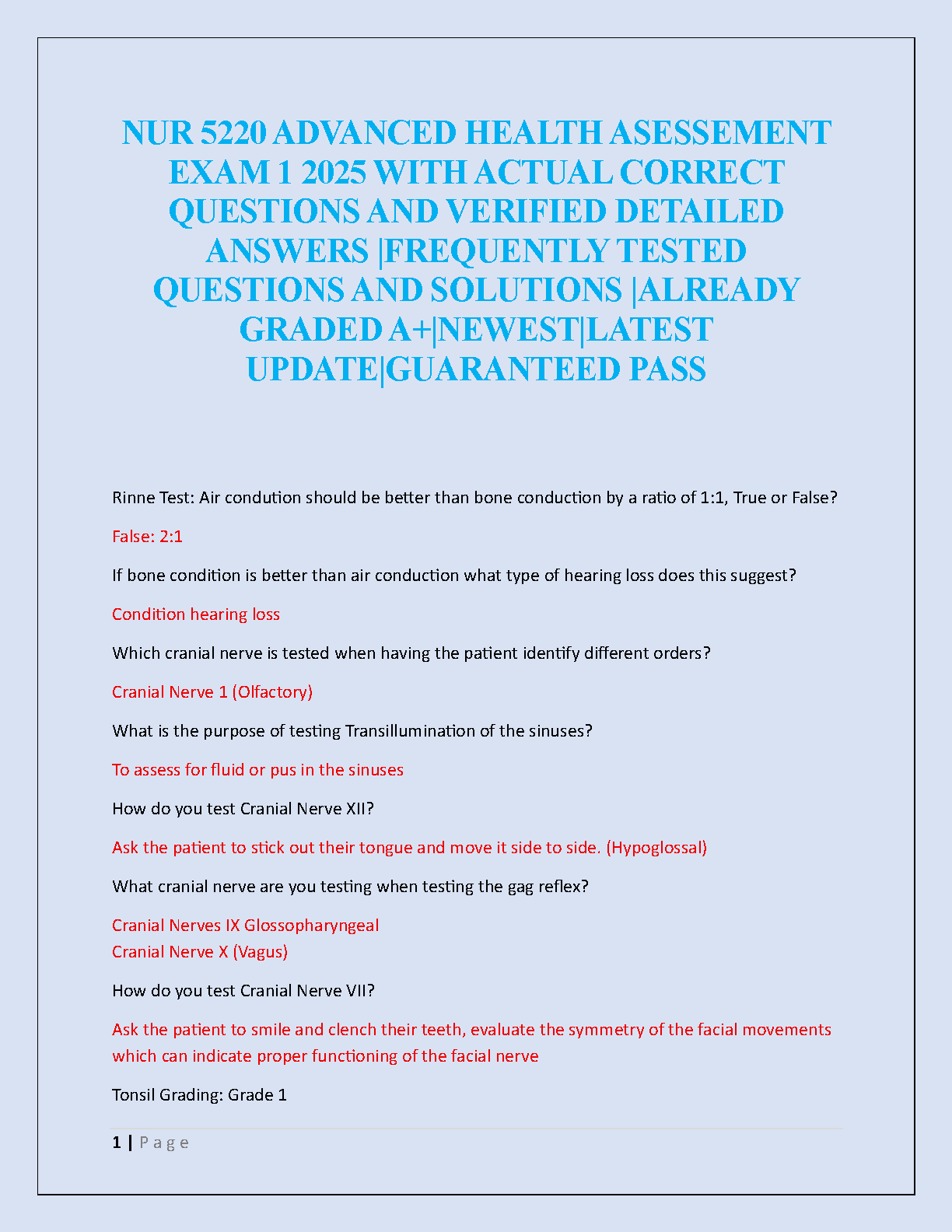 Ace your NUR 5220 Advanced Health Assessment Exam 1 with this ultimate test bank, newly updated for the 2025/2026 academic year. This comprehensive resource is packed with a wide range of frequently tested questions and meticulously verified, detailed answers to ensure you grasp key concepts. Covering crucial topics like the Rinne test, cranial nerve assessments (Olfactory, Facial, Vagus, Hypoglossal), and physical examination techniques, this guide is designed to help you achieve an A+ grade. Prepare effectively, boost your confidence, and pass your exam on the first attempt with our guaranteed-to-pass study materials.