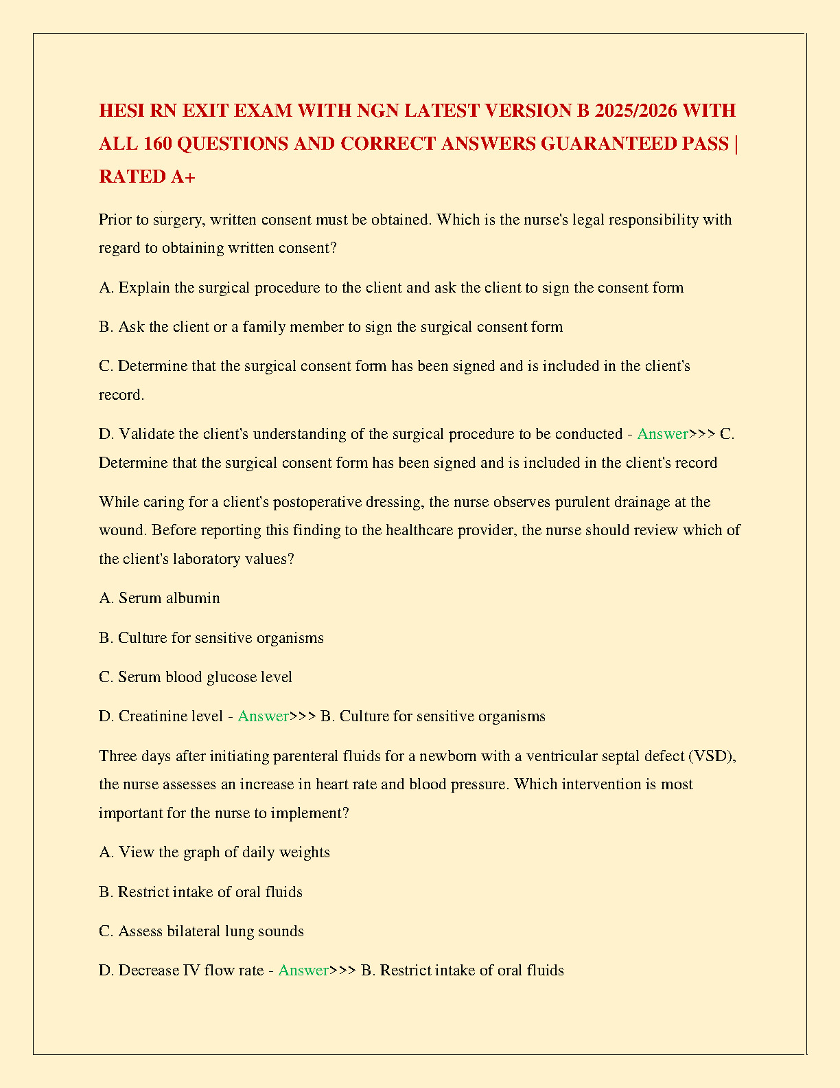 Achieve A+ results on your nursing boards with our comprehensive study guide for the HESI RN Exit Exam NGN, Latest Version B for 2025/2026. This essential resource contains all 160 questions, complete with verified and accurate answers, designed to help you master the material and pass on your first attempt. Our guide is meticulously updated to reflect the latest Next Generation NCLEX (NGN) format, providing you with the confidence and knowledge needed to excel. Avoid the stress of resits and fast-track your nursing career with this top-rated preparation tool.