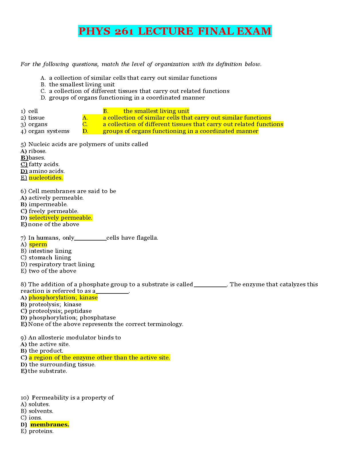 Elevate your study strategy and master your PHYS 261 Final Exam with our comprehensive Test Bank for 'Human Physiology: An Integrated Approach,' 9th Edition by Dee Unglaub Silverthorn. This essential resource is packed with a wide range of multiple-choice questions and verified answers, mirroring the format and difficulty of the actual exam. Dive deep into key topics such as levels of biological organization, cell membrane properties, enzyme kinetics, and nucleic acid structure. By using this test bank, you can efficiently test your knowledge, pinpoint weak spots, and build the confidence needed to excel. Download today and take the most effective step towards acing your physiology final!