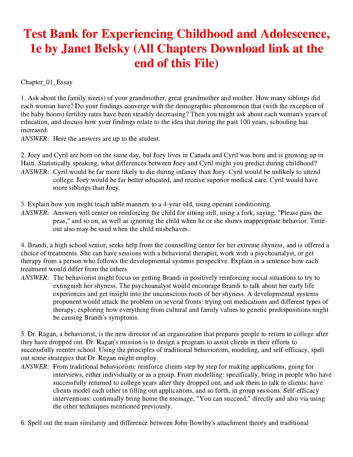 Test Bank for Experiencing Childhood and Adolescence, 1ST EDITION by Janet Belsky (All Chapters)