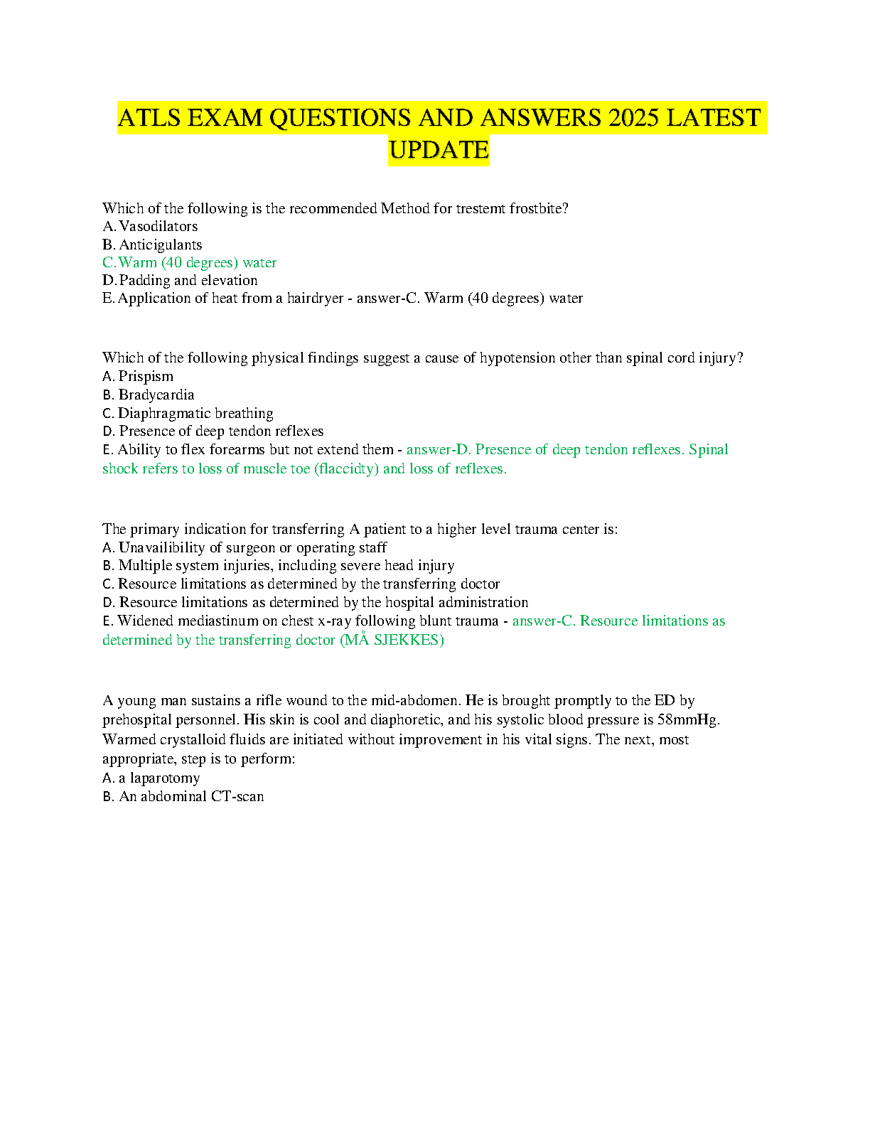 Ace your Advanced Trauma Life Support (ATLS) certification with confidence! This is the latest 2025 updated Test Bank for the 10th Edition of the ATLS Student Course Manual by the American College of Surgeons. It provides a comprehensive collection of exam-style questions and detailed, verified answers. Designed to help you master critical trauma care concepts, this resource is your ultimate study companion for passing the ATLS exam on your very first try. Avoid the stress and cost of resits by preparing with questions that mirror the actual test format and difficulty. Get immediate access to this essential study guide and take the first step towards your ATLS certification success.