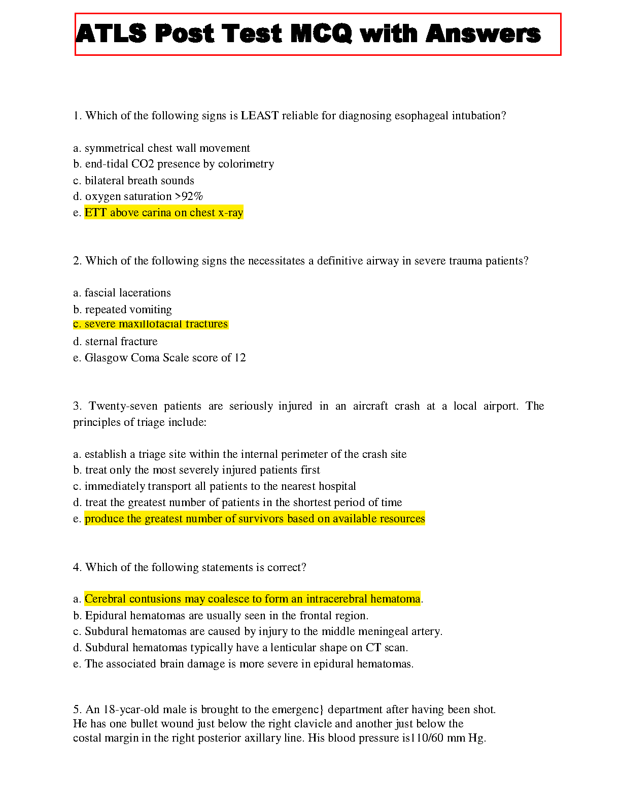 Ace your Advanced Trauma Life Support (ATLS) certification with this comprehensive test bank for the 10th Edition post-test. This essential study resource features a collection of multiple-choice questions (MCQs) complete with verified answers, directly mirroring the format and difficulty of the official ATLS exam. Master key concepts in trauma assessment, airway management, triage, and critical interventions. Our ATLS 10th Edition test bank is designed to build your confidence, identify knowledge gaps, and ensure you're fully prepared to pass on your first attempt. Download now for immediate access to the questions and answers you need to succeed.