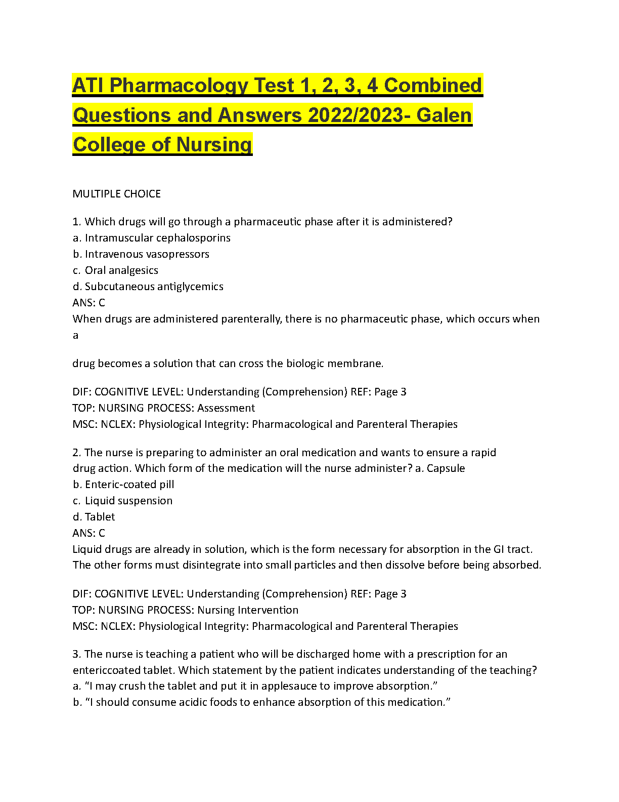 Ace your nursing pharmacology exams with this comprehensive ATI Pharmacology Test Bank! This extensive resource combines Tests 1, 2, 3, and 4 from Galen College of Nursing, providing a complete set of multiple-choice questions. Each question comes with a verified correct answer and a detailed rationale to help you understand the underlying concepts, not just memorize facts. The questions are structured similarly to the NCLEX, covering key topics like pharmaceutics, drug administration, and patient teaching. This test bank is the ultimate study tool to master ATI Pharmacology, boost your grades, and prepare effectively for your NCLEX exam. Get instant access to the material and start studying smarter today!