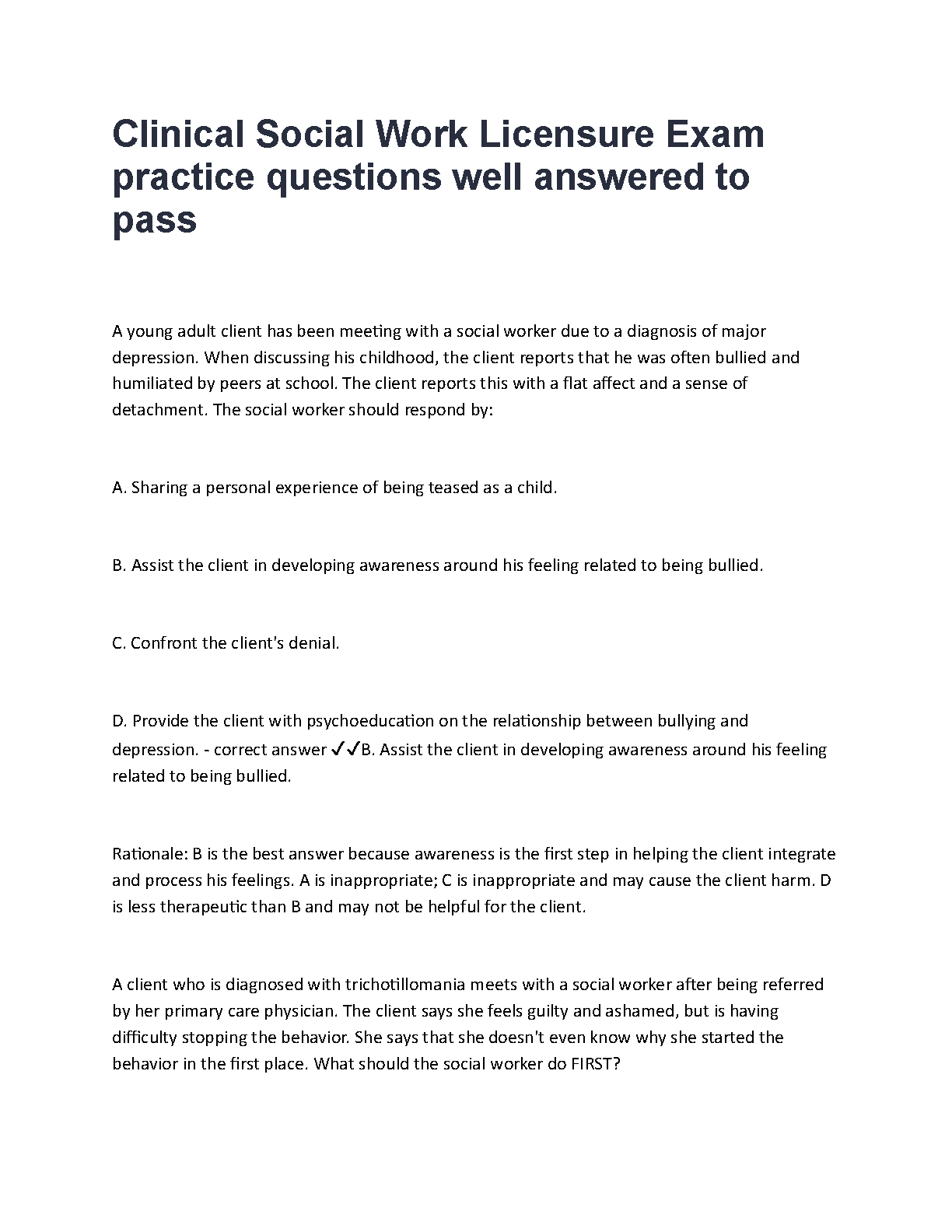 Master the Clinical Social Work Licensure Exam (LCSW) and pass on your first attempt with our updated 2025/2026 test bank. This comprehensive resource features a wide range of practice questions covering realistic clinical scenarios, complete with detailed answers and expert rationales. Designed to build your critical thinking skills and exam confidence, this study guide is the ultimate tool to help you succeed in your licensure journey and avoid costly resits.