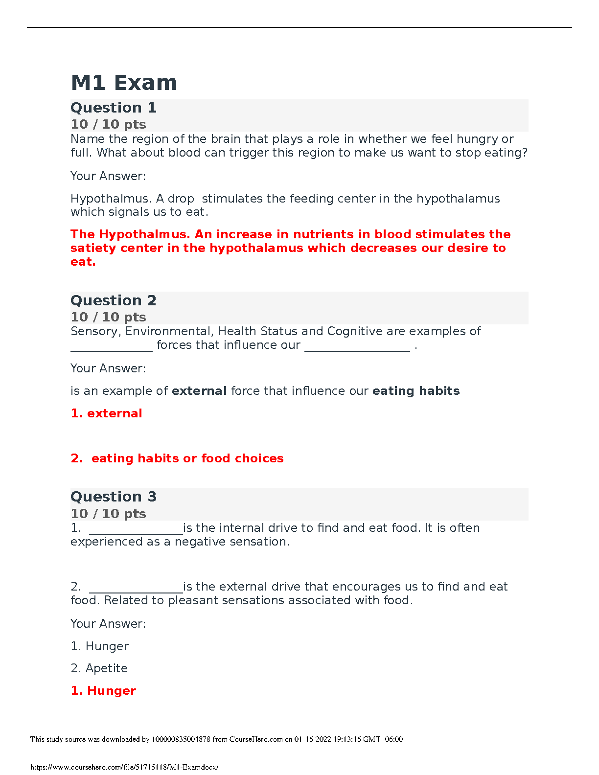 Get ready to ace your Module 1 Nutrition exam with this comprehensive test bank! This resource provides a complete set of questions and expertly verified answers, focusing on crucial topics like the role of the hypothalamus in hunger and satiety, the difference between hunger and appetite, and the sensory, environmental, and cognitive factors that influence our eating choices. Each answer is clearly explained, making it the perfect study tool to master the foundational concepts of nutrition. Download now to boost your confidence and pass your exam on the first try, avoiding any resits for the 2025/2026 academic year!