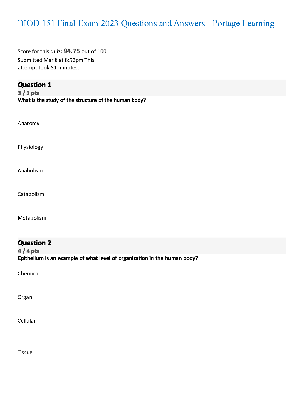 Elevate your study strategy and guarantee success in your Portage Learning BIOD 151 final! This is the ultimate test bank for the Essential Human Anatomy & Physiology I course, featuring the complete 2023 final exam with verified questions and correct answers. Derived from a top-scoring submission (94.75%), this guide provides invaluable insight into the exam structure and question types. Prepare effectively, master the material, and pass your BIOD 151 exam with confidence. An essential tool for any student aiming for an A.