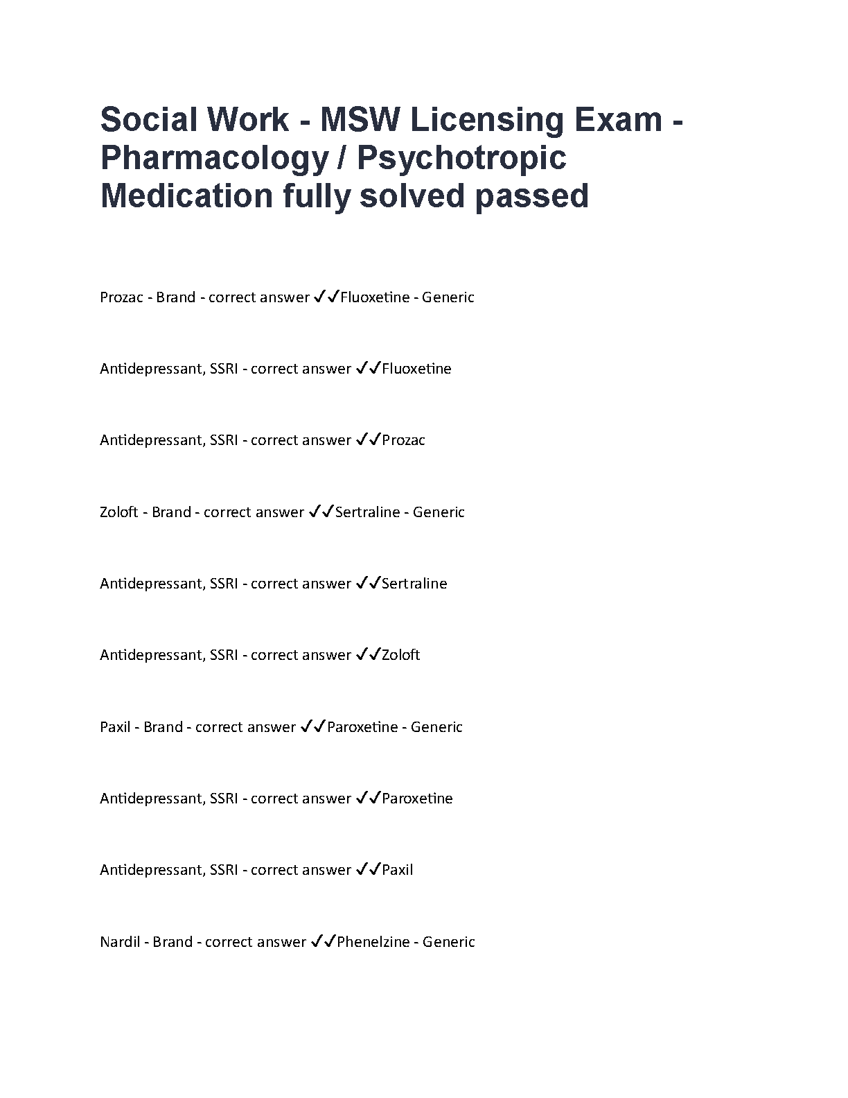 Master the challenging pharmacology section of the MSW Social Work Licensing Exam with our comprehensive 2025/2026 test bank. This essential study guide is laser-focused on psychotropic medications, providing a complete set of questions and fully solved, verified answers. Gain the confidence you need by mastering key concepts, including brand names, generic names, and drug classifications like SSRIs. This resource is expertly designed to help you avoid resits and pass your MSW licensure exam on the very first attempt. Download now to start studying smart and secure your career in social work.