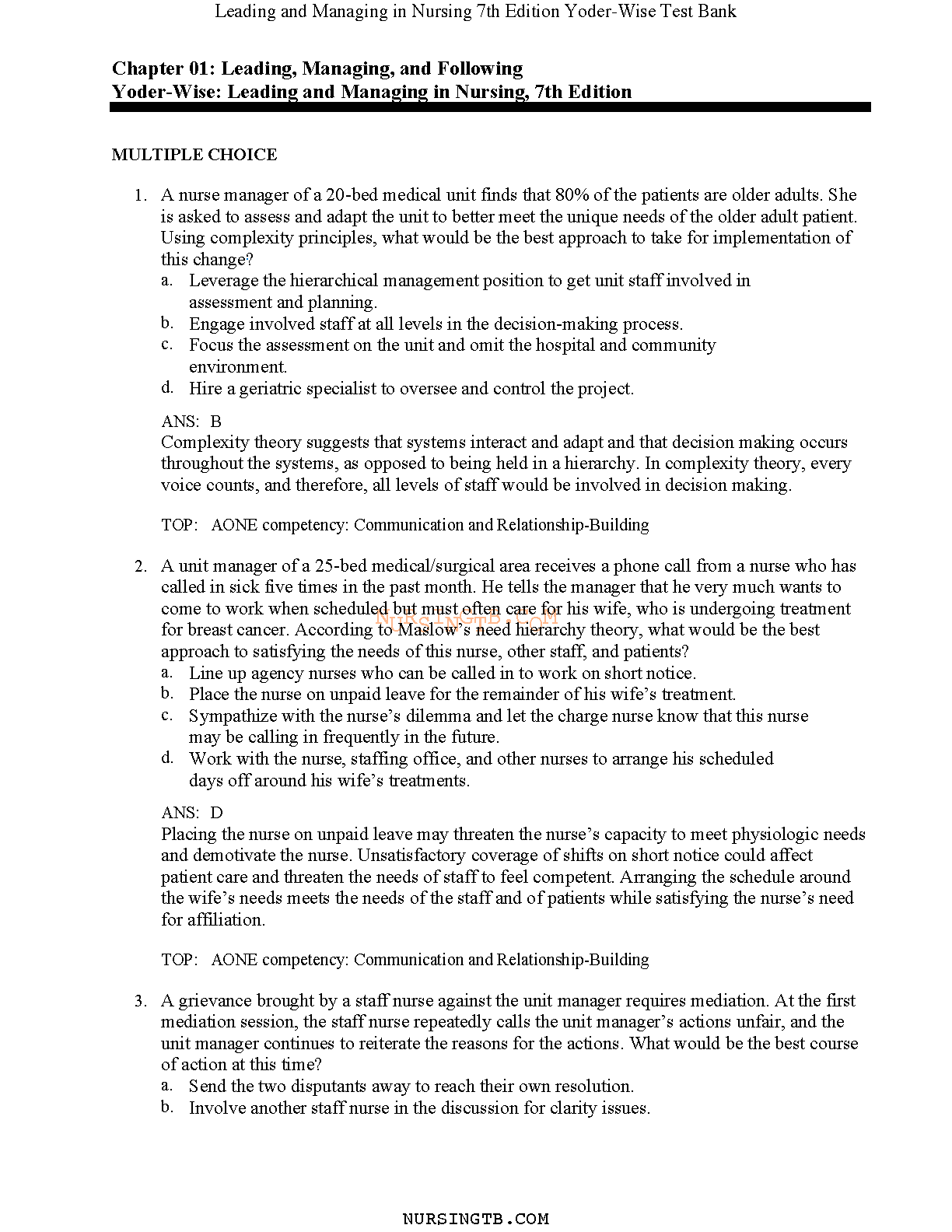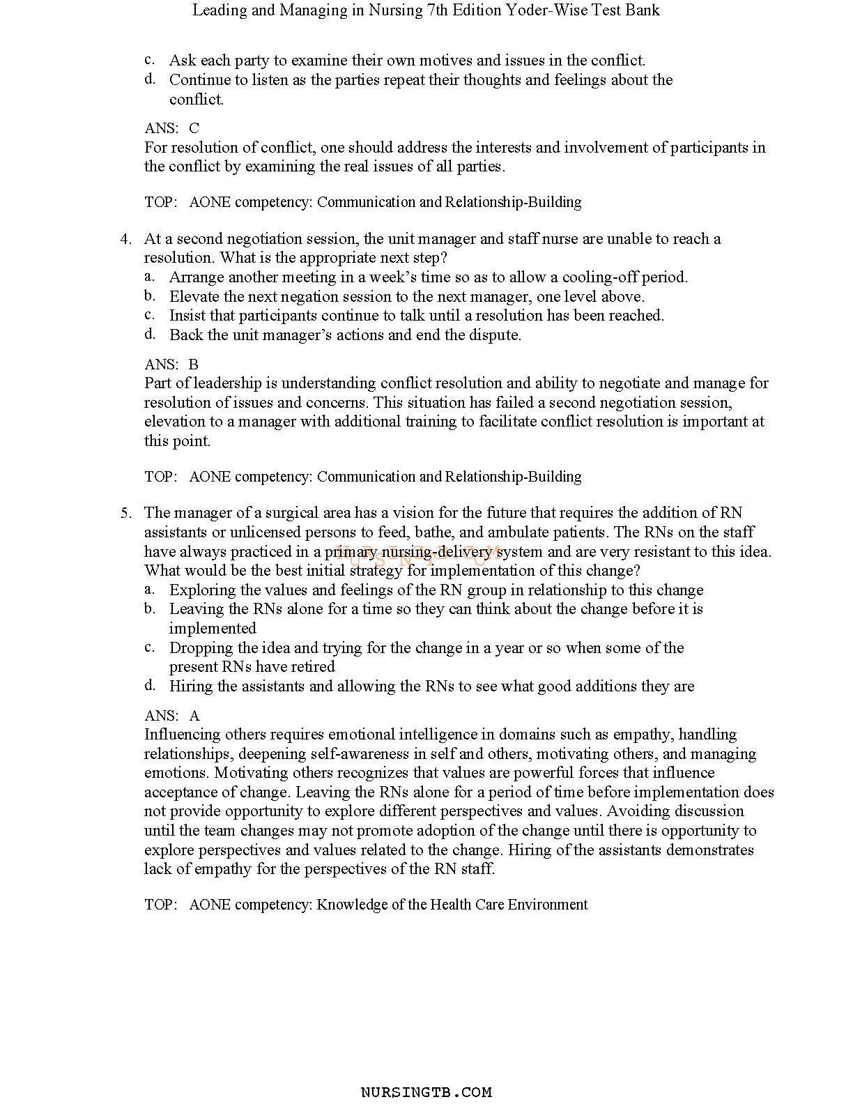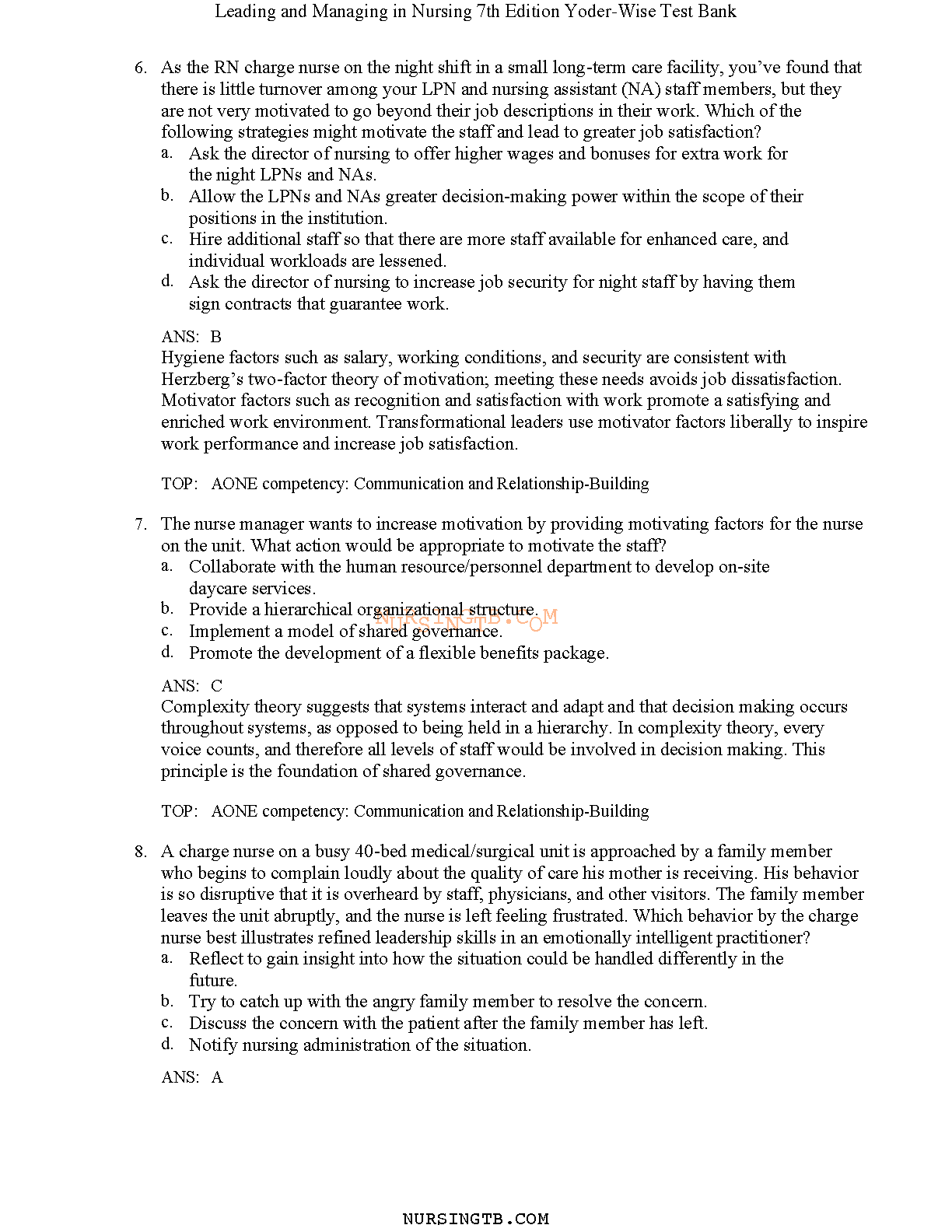 Test Bank for Leading and Managing in Nursing, 7th Edition by Patricia S. Yoder-Wise, Susan M. Sportsman, and Joseph T. Dols