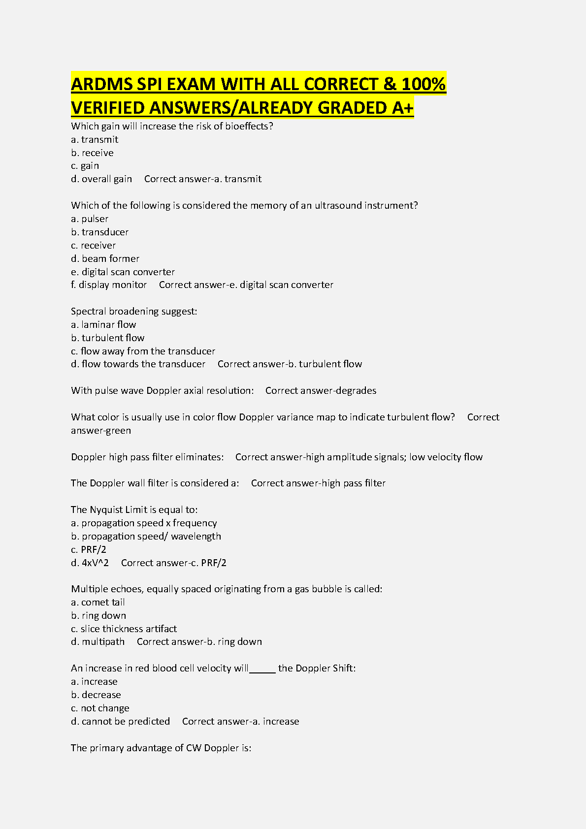 Master the ARDMS Sonography Principles and Instrumentation (SPI) exam with our premier test bank, meticulously compiled to guarantee your success. This A+ graded resource is packed with 100% correct and verified questions and answers, covering all essential topics in ultrasound physics. Deepen your understanding of Doppler principles, bioeffects, instrumentation, artifacts, and the Nyquist limit. This study guide is expertly designed to help you pass on your first try, building the confidence you need to avoid resits and excel in your certification. Get the edge you need and ace your SPI exam!