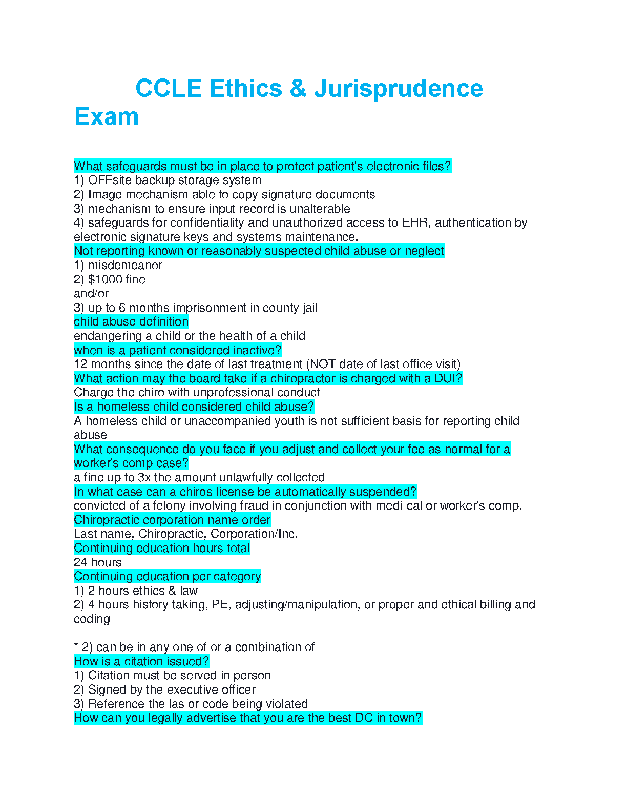 Prepare to excel in your California Chiropractic Licensing Exam with our latest 2025/2026 study guide for the Ethics & Jurisprudence section. This comprehensive resource provides detailed answers to critical exam questions, ensuring you master the essential legal and ethical principles of chiropractic practice in California. Key topics covered include patient confidentiality and electronic file security, mandatory child abuse reporting, professional conduct, worker's compensation procedures, continuing education mandates, and compliant advertising. This guide is specifically designed to help you pass the CCLE on your first try, saving you time and stress. Get the targeted preparation you need for success!