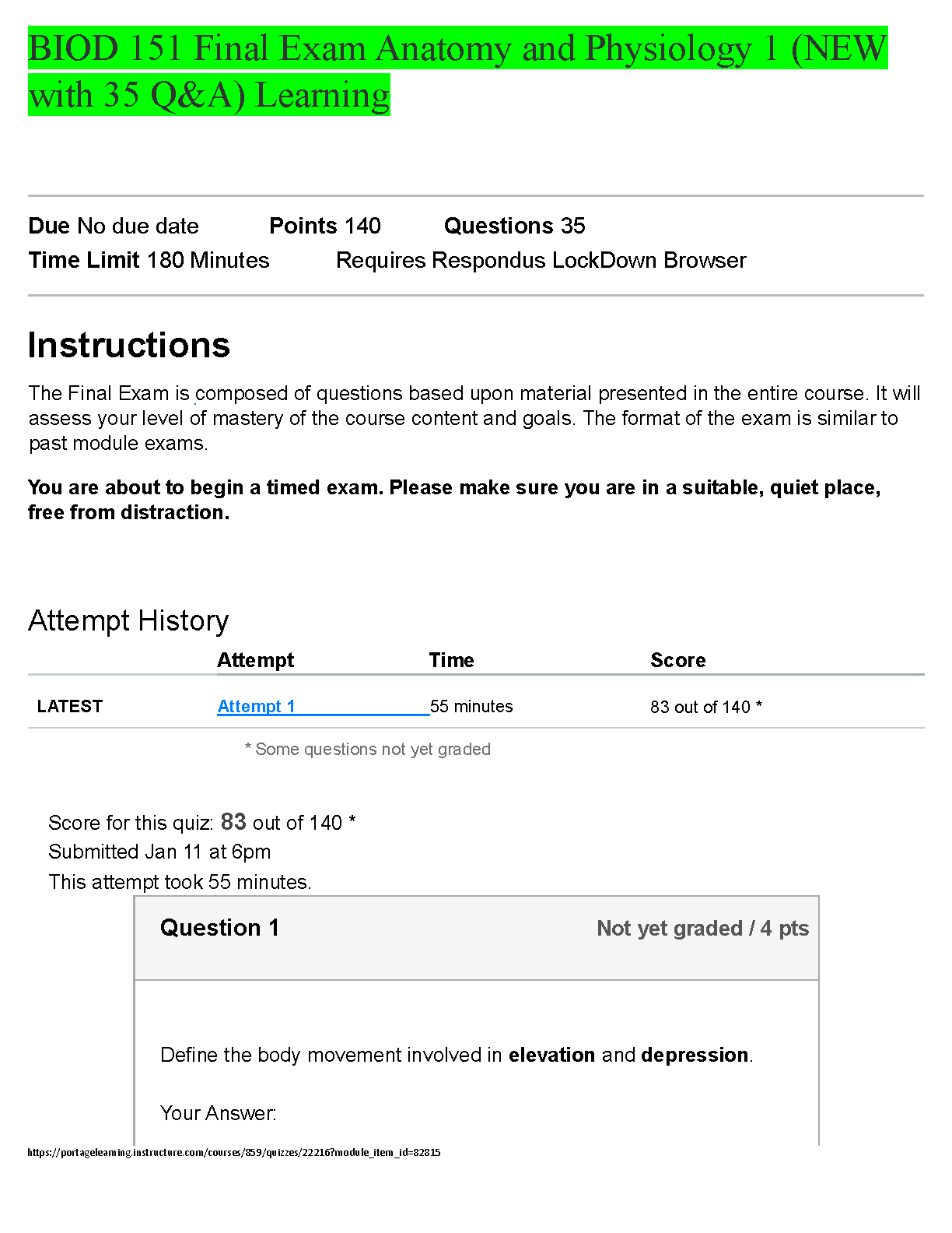 Get ready to ace your BIOD 151 Final Exam with this comprehensive test bank for Portage Learning's Anatomy and Physiology 1 course. This essential study guide features 35 detailed questions and their corresponding answers, mirroring the actual final exam format. By practicing with these targeted questions, you will gain the confidence and in-depth knowledge required to master the course material and achieve an excellent grade. This is the ultimate resource to help you pass on your first attempt and avoid resits.