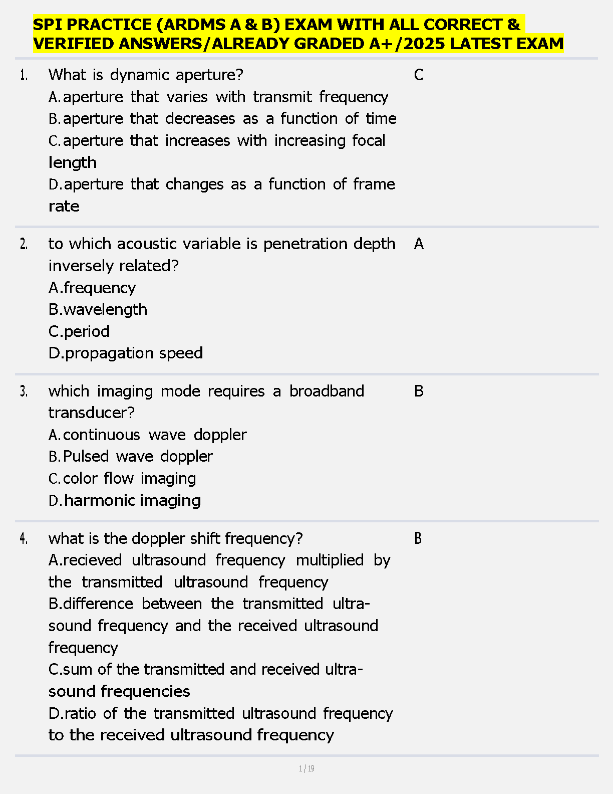 Master the SPI ARDMS Exam 2025: A+ Graded Test Bank with 100% Correct and Verified Questions & Answers for Sonography Principles