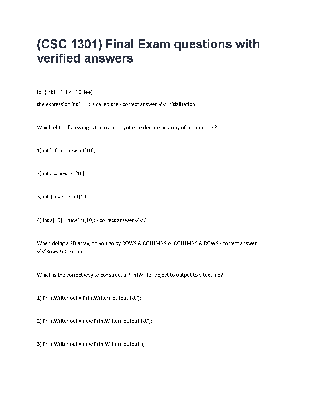 Ace your CSC 1301 Principles of Programming final exam with this comprehensive study guide for the 2025/2026 academic year. This exam elaboration provides a complete set of final exam questions coupled with meticulously verified answers. Master essential topics like loops, array declarations, 2D arrays, and file output with PrintWriter. Designed to mirror the actual exam format, this resource is your key to understanding complex concepts, boosting your confidence, and passing on the first try. Stop worrying about resits and secure your top grade today!