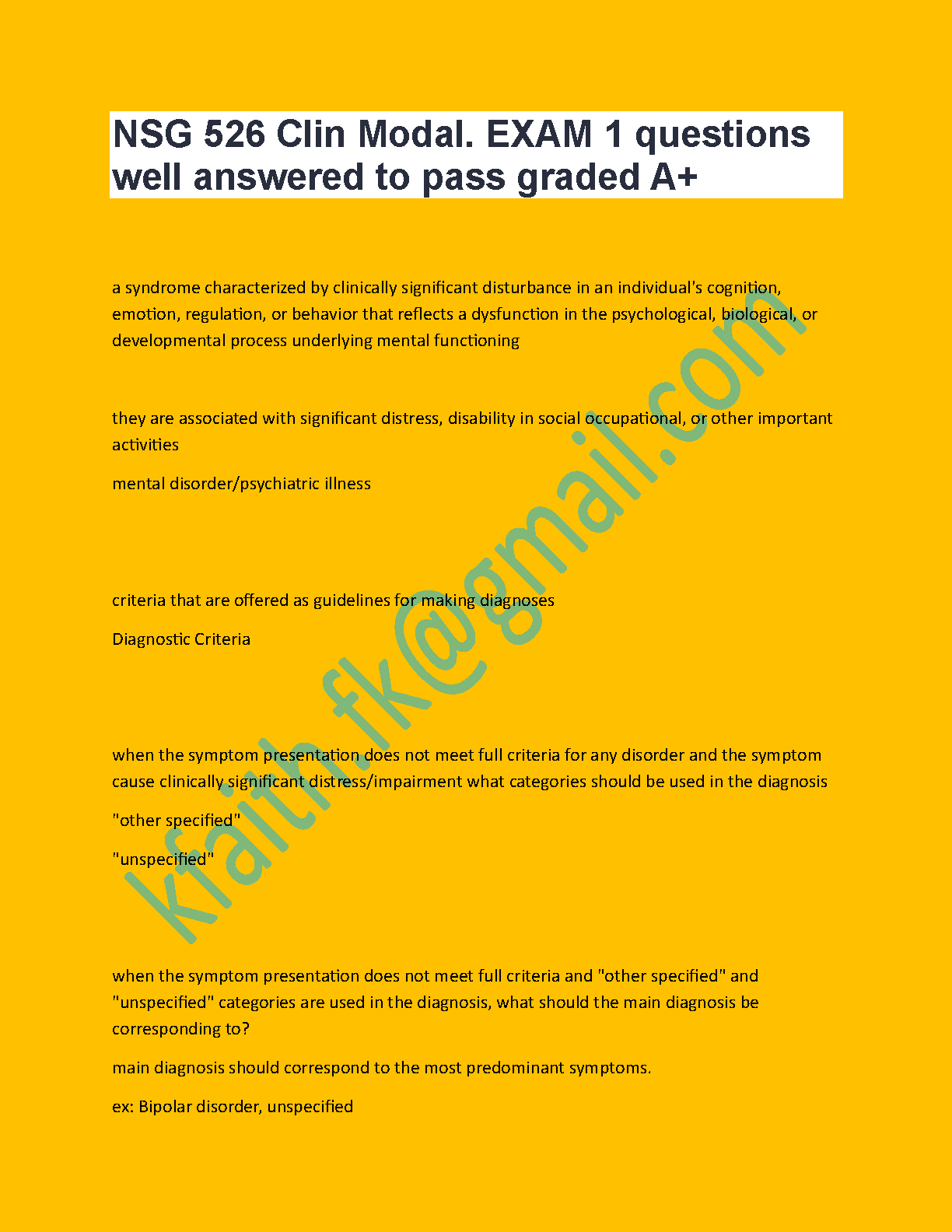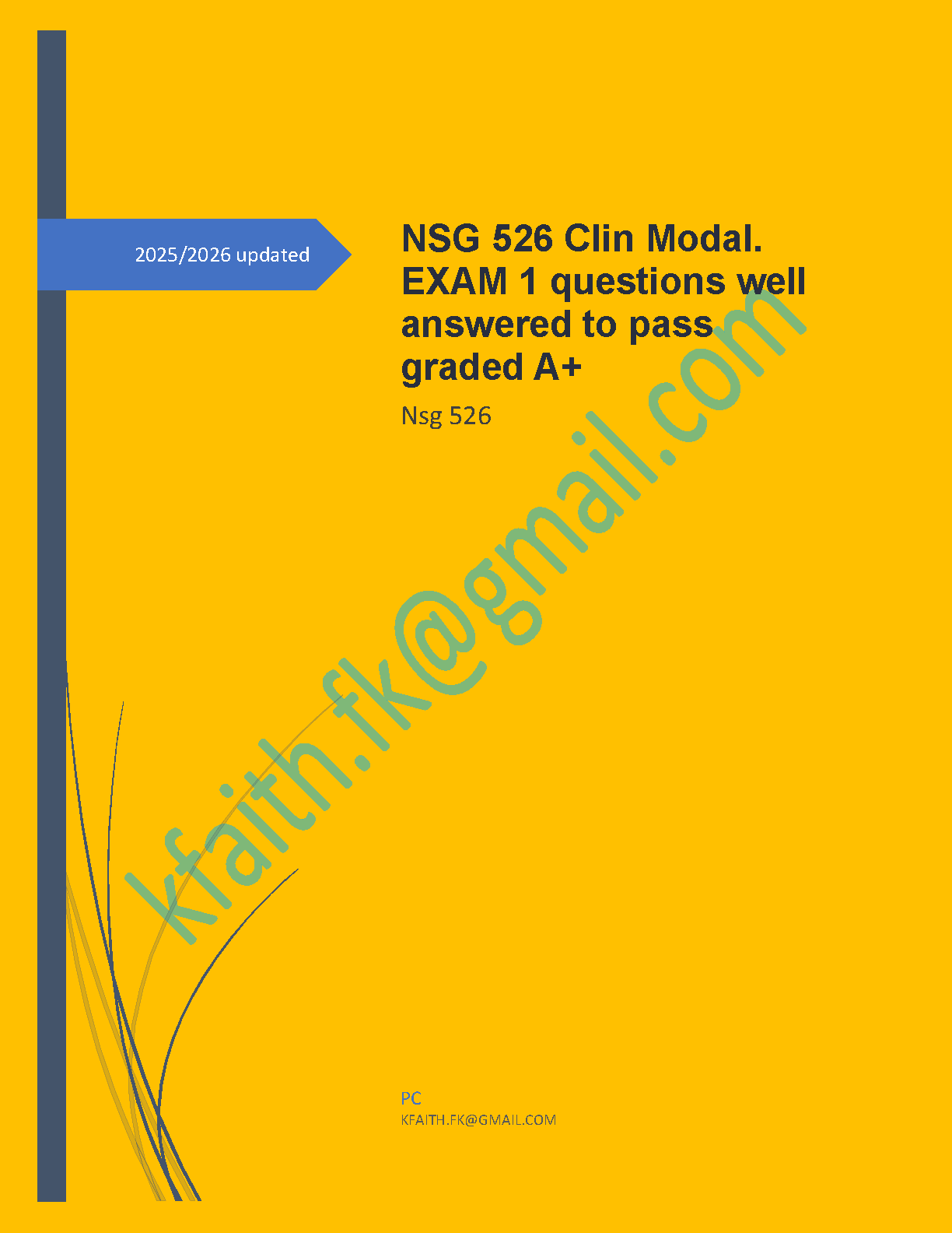 Struggling with NSG 526 Clinical Modalities? Boost your confidence and secure a top grade with our latest Exam 1 study resource for the 2025/2026 academic year. This guide features a comprehensive collection of questions paired with detailed, A+-graded answers, specifically designed to help you master the key concepts. Prepare effectively, walk into your exam with confidence, and pass on your very first attempt. Avoid the stress of resits and achieve the academic success you deserve with this essential study tool.