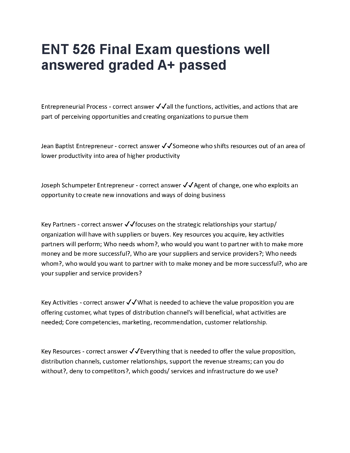 Unlock exam success with our premium ENT 526 Final Exam study guide for the 2025/2026 academic year. This resource provides a complete set of meticulously answered questions, verified for accuracy, that have already achieved an A+ grade. Dive deep into crucial topics like the Entrepreneurial Process, the roles of Key Partners, Activities, and Resources, and definitions from pioneering entrepreneurs. This is your ultimate tool to understand complex concepts, study effectively, and pass your final exam with confidence on the very first attempt. Avoid the stress of resits and secure the top grade you deserve!