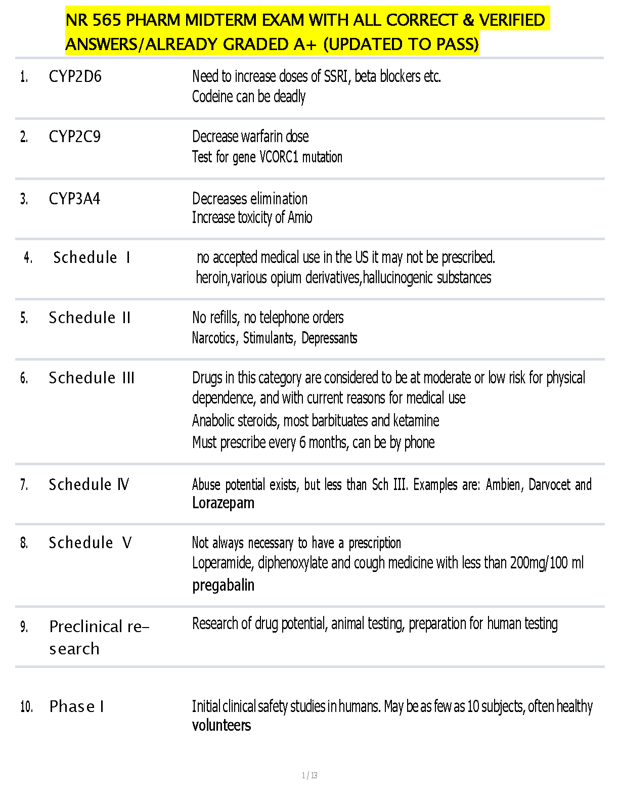 Ace your NR 565 Advanced Pharmacology Midterm Exam with this comprehensive and up-to-date study resource for the 2025/2026 academic year. This guide provides a complete set of questions with detailed, verified answers that have already secured an A+ grade. Focus your study on crucial topics such as drug metabolism via Cytochrome P450 enzymes (CYP450), the classification and regulations of DEA drug schedules, and the essential phases of drug development. Designed to ensure you pass confidently on your first try, this exam preparation material is your key to mastering complex pharmacological concepts and avoiding resits. Download now for immediate access and start studying smart for a guaranteed top grade!