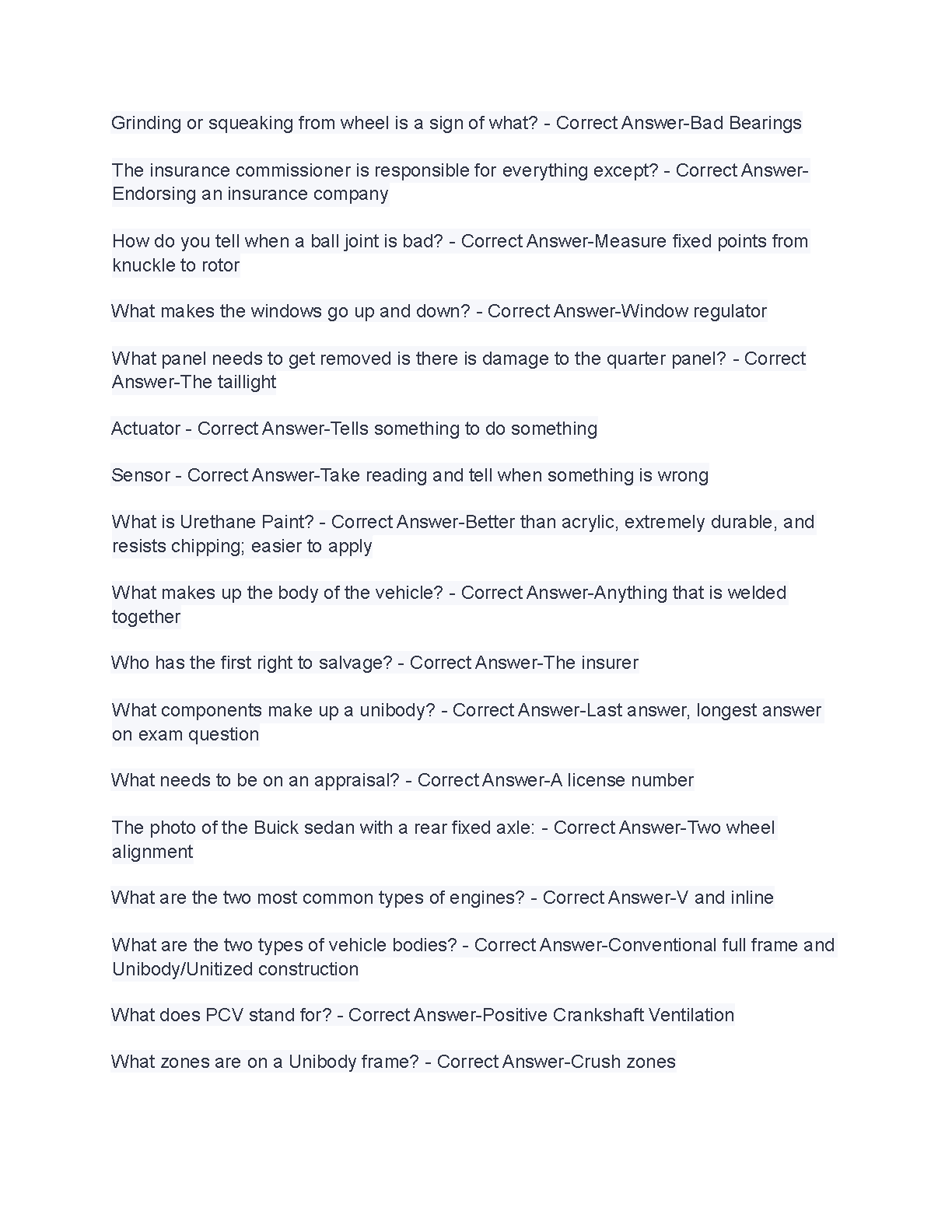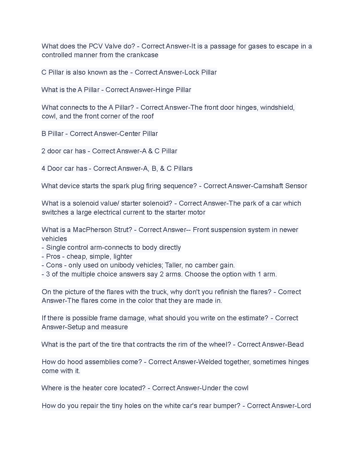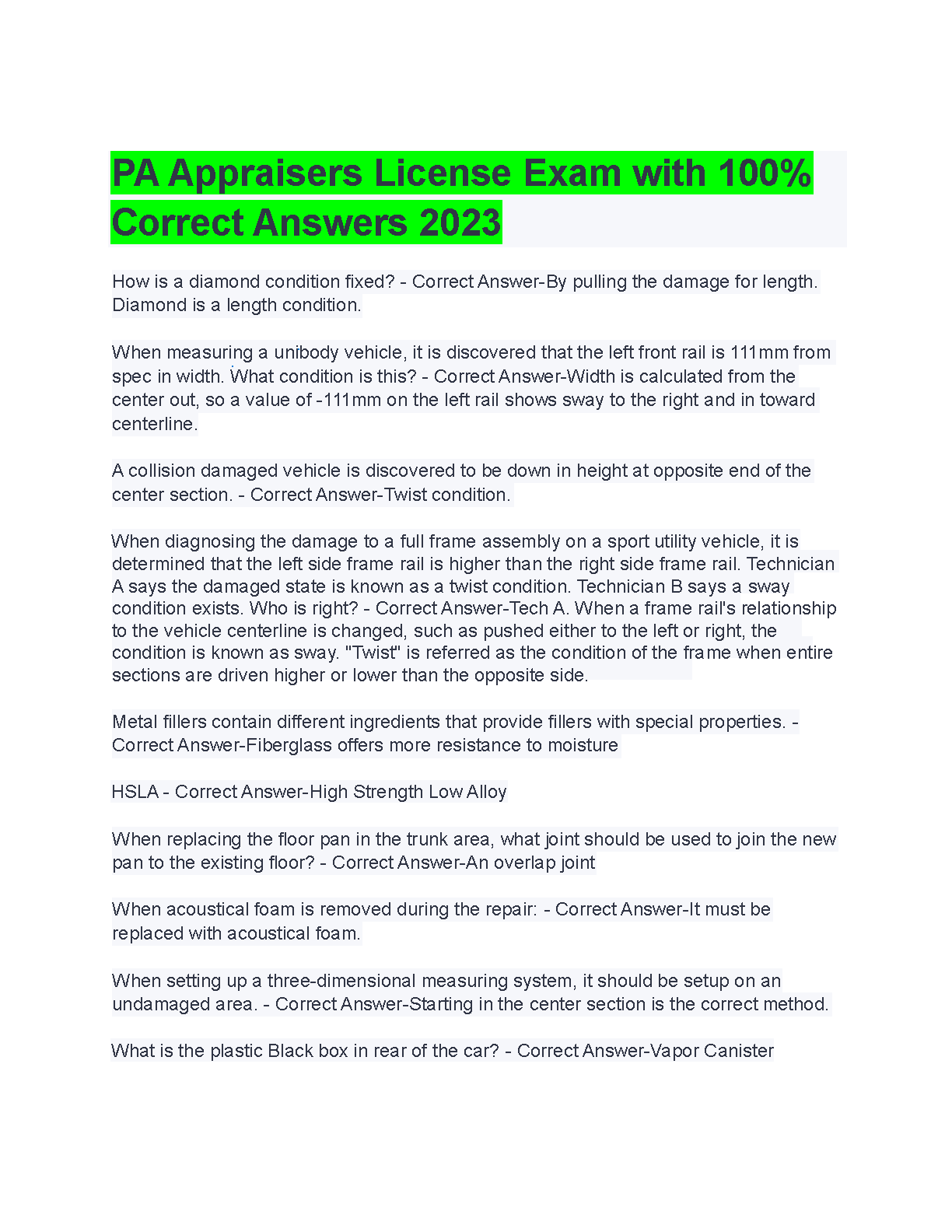 Ace your Pennsylvania Appraisers License Exam on the very first try with our comprehensive 2025/2026 test bank! This ultimate study guide contains a complete collection of real exam questions and 100% correct, verified answers. Master crucial topics including frame damage diagnosis (twist, sway, diamond conditions), unibody vehicle measurements, materials like HSLA and metal fillers, and essential components. Our proven Q&A format is designed for efficient study, ensuring you have the knowledge and confidence to pass your exam with ease and avoid resits. Secure your appraiser license today!
